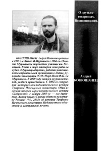 О друзьях- товарищах. Воспоминания. | | | .. Андрей КОНЮШЛНКЦ КОНЮШАНЕЦ Андрей Иванович родился в 1965 г. в Литве. В Мурманске с 1966-го. Окон чил Мурманское мореходное училище им. Ме- сяцева. Ходил в море мастером лова рыбы на судах «Мурманрыбпрома», работал каменщи ком в строительной организации в Литве, р у ководил магазинами ОА О «Норд-Вест Ф.К. » в Мурманске. В 2000 году занялся журналисти кой, увлёкся краеведением. С 2002-го сотруд ник историко-исследовательского центра Трифонов Печенгского монастыря. Один из организаторов Просветительского центра «Доброхот», с ноября 2003-го — его дирек тор. Автор книги «Святая обитель на верши не России» (М., 2002) об истории Трифонов Печенгского монастыря. Публикуется в обла стной и центральной печати.