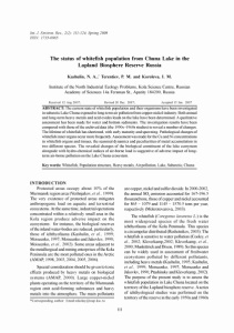 Int. J. Environ. Res., 2(2): 111-124, Spring 2008 ISSN: 1735-6865 The status of whitefish population from Chuna Lake in the Lapland Biosphere Reserve Russia Kashulin, N. A.,* Terentiev, P. M. and Koroleva, I. M. Institute of the North Industrial Ecology Problems, Kola Science Centre, Russian Academy of Sciences 14a Fersman St., Apatity 184200, Russia Received 12 Aug 2007; Revised 20 Dec. 2007; Accepted 15 Jan. 2007 ABSTRACT: The current state of whitefish population and their organisms have been investigated in subarctic Lake Chuna exposed to long-term air pollution from copper-nickel industry. Both annual and long-term heavy metals and acid oxides loads on the lake have been determined. A qualitative assessment has been made for water and bottom sediments. The investigation results have been compared with those of the archived data (the 1950s -1960s studies) to reveal a number of changes. The lifetime of whitefish has shortened, with early maturity and spawning. Pathological changes of whitefish inner organs occur more frequently. Assessment was made for the Cu and Ni concentrations in whitefish organs and tissues, the seasonal dynamics and peculiarities of metal accumulation in two different species. The revealed changes of the biological constituent of the lake ecosystem alongside with hydro-chemical indices of air-borne load is suggestive of adverse impact of long term air-borne pollution on the Lake Chuna ecosystem. Key words: Whitefish, Population structure, Heavy metals, Air pollution, Lake, Subarctic, Chuna INTRODUCTION Protected areas occupy about 10% of the Murmansk region area (Veshnjakov, et al., 1999). The very existence of protected areas mitigates anthropogenic load on aquatic and terrestrial ecosystems. At the same time, industrial operations concentrated within a relatively small area in the Kola region produce adverse impact on the ecosystems: for instance, the biological reserves ofthe inland water-bodies are reduced, particularly, those of ichthyofauna (Kashulin, et al., 1999; Moiseenko, 1997; Moiseenko and Jakovlev, 1990; Moiseenko, et al., 2002). Some areas adjacent to the metallurgical and mining enterprises ofthe Kola Peninsula are the most polluted ones in the Arctic (AMAP, 1998, 2003, 2004, 2005, 2006). Special consideration should be given to toxic effects produced by heavy metals on biological systems (AMAP, 2000). Large copper-nickel plants operating on the territory of the Murmansk region emit acid-forming substances and heavy metals into the atmosphere. The main pollutants *Corresponding author: Email-nikolay@inep.ksc.ru are copper, nickel and sulfur dioxide. In 2000-2002, the annual SO2emission accounted for 167-196.5 thousand tons, those of copper and nickel accounted for 865 - 1079 and 1145 - 1570.5 tons per year, respectively (Mokrotovarova, 2003). The whitefish (Coregonus lavaretus L .) is the most widespread species o f the fresh water ichthyofauna of the Kola Peninsula. This species is circumpolar distributed (Reshetnikov, 2003). The whitefish is sensitive to water pollution (Cooley, et al., 2002; Kleverkamp,2002; Kleverkamp, et al., 2000; Munkittrick and Dixon, 1989). So this species can be widely used in assessment of freshwater ecosystems polluted by different pollutants, including heavy metals (Kashulin, 1995; Kashulin, et al., 1999; Moiseenko, 1997; Moiseenko and Jakovlev, 1990; Ptashinsky and Kleverkamp, 2002). The purpose of the present study is to assess the whitefish population in Lake Chuna located on the territory ofthe Lapland biosphere reserve. A series of ichthyological studies was performed on the territory ofthe reserve in the early 1950s and 1960s 111