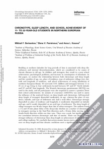 Chronobiol Int Downloaded from informahealthcare.com by 217.66.146.98 on 07/23/10 For personal use only. Chronobiology International, 27(6): 1259-1270, (2010) i n f o r m s Copyright © 2010 Informa Healthcare USA, Inc. healthcare ISSN 0742-0528 p rin t/1525-6073 online ------------------- DOI: 10.3109/07420528.2010.487624 CHRONOTYPE, SLEEP LENGTH, AND SCHOOL ACHIEVEMENT OF 11- TO 23-YEAR-OLD STUDENTS IN NORTHERN EUROPEAN RUSSIA Mikhail F. Borisenkov ,1 Elena V. Perminova ,2 and Anna L. Kosova 3 1Institute o f Physiology, Komi Science Centre, Ural Bran ch o f Russian Academy o f Science, Syktyvkar, Russia 2Polar Geophysical Institute, Kola SC o f Russian Academy o f Science, Apatity, Russia yInstitute o f Problems o f In dustrial Ecology o f the No rth, Kola SC o f Russian Academy o f Science, Apatity, Russia Residing at no rth ern latitudes for long periods o f time is associated with sleep dis turbances and internal desynchronization, which are considered to be causes of chronic diseases in old age. In children and teenagers, they result in a poor school achievement, psychological problems, and increase in consumption of stimulants. In this paper, we analyze the relationship between both chronotype and sleep length and the variables of age, sex, place of residence, type of settlement (village/city), lati tude and longitude of residence, and school achievement of young inhabitants of no rth ern European Russia. We surveyed 1101 children and teenagers between 11 to 23 yrs of age living in four settlements located between 59° and 67° North latitude and 33° and 60° East longitude. T he Munich chronotype questionnaire (MCTQ) was used in the study, and all participants were also required to answer a question about their school achievements. An analysis o f covariance (ANCOVA) was used to assess the influence o f the analyzed factors on sleep length and chronotype. Self-reported sleep length of teenagers depended moderately on age, whereas the place of resi dence, latitude, and type of settlement only had a weak effect. Chronotype strongly depended on place of residence and longitude; it moderately depended on latitude and age; and it weakly depended on sex and type of settlement. T he sleep length of village teenagers was 46 min longer than that of u rban teenagers. T he authors found a 1 h and 18 min phase delay o f the sleep-wake rhythm (as a marker o f chronotype) in teenagers moving in the East-West direction and a 16-min delay moving in the South-North direction within one time zone. There was a weak, bu t significant, posi tive correlation between chronotype and time of sunrise. There was about a 2-fold stronger influence of chronotype than sleep length on achievement of school children and college students. We conclude that socioeconomic factors exert a significant influ ence on sleep length and that climatic conditions exert a significant influence or Submitted December 10, 2009; Returned for revision January 18, 2010; Accepted April 5, 201C Address correspondence to Mikhail F. Borisenkov, PhD, Institute of Physiology Pervon 50, 167982 Syktyvkar, Russia. E-mail: borisenkov@physiol.komisc