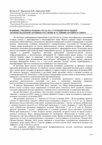 Косова А.Л .1, Перминова Е.В.2, Борисенков М.Ф .3 1Учреждение Российской академии наук Институт проблем промышленной экологии Севера Кольского НЦРАН, г. Апатиты kosova@inep.ksc.ru 2ГК «Олимпстрой», г. Сочи eperminova@yandex.ru 3Учреждение Российской академии наук Институт физиологии Коми НЦ УрО РАН, г. Сыктывкар borisenkov@physiol.komisc.ru ВЛИЯНИЕ СМЕННОГО РЕЖИМА ТРУДА НА СУТОЧНЫЙ РИТМ ОБЩЕЙ АНТИОКСИДАНТНОЙ АКТИВНОСТИ СЛЮНЫ В УСЛОВИЯХ КРАЙНЕГО СЕВЕРА_______ По критериям районирования Европейский Север России по степени дискомфортности проживания человека отнесен к дискомфортной и гипокомфортной зонам. Жители северных широт испытывают воздействие неблагоприятных климатических факторов (контрастный годовой температурный и световой режимы, значительные колебания интенсивности электромагнитных излучений) [5]. Климатические условия севера воздействуют на многие физиологические системы организма человека, но наиболее подвержено изменениям функционирование антиоксидантной и циркадианной систем. В настоящее время ведутся исследования нарушений функции циркадианной системы, как фактора риска преждевременного старения и развития возрастных патологий (заболеваний сердечно-сосудистой системы, нейродегенеративных и онкологических заболеваний) [3]. Сравнительный анализ показал, что среди жителей северных широт, по сравнению с жителями стран, расположенных в умеренных и южных широтах, повышен риск возникновения онкологических заболеваний [2]. Среди причин смертности населения Мурманской области 1-ое и 3-тье места занимают болезни системы кровообращения и новообразования. При этом отмечается неуклонный рост этих показателей. В настоящее время ведутся поиски механизмов негативного воздействия на организм человека нарушения фотопериода. Известно, что наиболее сильное влияние нарушений световой режим, особенно свет в ночное время, оказывает на функцию эпифиза и в первую очередь на продукцию мелатонина (МТ). МТ является гормоном, участвующим в регуляции самых различных систем и органов человека, но основная функция МТ заключается в обеспечении синхронизации околосуточных и окологодовых ритмов организма с суточными и сезонными ритмами окружающей среды. Изменение режима освещения приводит к появлению хронического стресса с развитием различных патологических состояний, что ведет к изменению поведения, снижению работоспособности, возникновению заболеваний, более раннему старению организма [1]. В работах (Борисенков, 2007-2008) было показано, что общая антиоксидантная активность (ОАА) слюны человека имеет выраженный суточный ритм, показатель ОАА адекватно отражает состояние циркадной системы организма и влияние на нее климатических и социальных факторов. Целью настоящего исследования стало изучение влияния сменного режима труда на суточную динамику и показатели ОАА слюны в условиях Крайнего Севера, а также возможности коррекции с помощью экзогенного мелатонина (МТ). Исследование проведено в г. Апатиты (67.340сш) в сентябре 2008 г. В исследовании приняли участие 16 практически здоровых добровольцев (женщины) в возрасте от 22 до 37 лет, не занятые физическим трудом (научные сотрудники, медицинский персонал). 1 группу составили добровольцы с дневным режимом труда (8 чел.). Отбор проб проводили в 2 этапа с разрывом в 7 дней. На втором этапе добровольцы принимали перорал