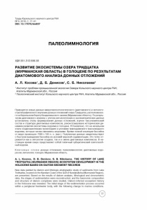 Труды Карельского научного центра РАН №9. 2018. С. 77-91 DOI: 10.17076/lim837 ПАЛЕОЛИМНОЛОГИЯ УДК 551.312:556.55 РАЗВИТИЕ ЭКОСИСТЕМЫ ОЗЕРА ТРИДЦАТКА (МУРМАНСКАЯ ОБЛАСТЬ) В ГОЛОЦЕНЕ ПО РЕЗУЛЬТАТАМ ДИАТОМОВОГО АНАЛИЗА ДОННЫХ ОТЛОЖЕНИЙ А. Л. Косова1, Д. Б. Денисов1, С. Б. Николаева 2 1Институт проблем промышленной экологии Севера Кольского научного центра РАН, Апатиты Мурманской обл., Россия 2Геологический институт Кольского научного центра РАН, Апатиты Мурманской обл., Россия Приводятся новые данные микропалеонтологического (диатомового) и литолого стратиграфического изучения донных отложений озера Тридцатка, расположенно го на Карельском берегу Кандалакшского залива (Мурманская область). По резуль татам диатомового анализа с учетом литологических и хронометрических данных установлены этапы формирования донных отложений, изучен таксономический состав и структура диатомовых комплексов, реконструирована историческая д и намика развития экосистемы водоема в голоцене. Установлено, что на начальном этапе осадконакопление происходило в условиях приледникового пресноводного водоема, которые затем сменились морскими. Время полной изоляции бассейна от моря произошло 7060 ± 160 л. н. (кал.). Полученные данные свидетельствуют о быстром выведении бассейна из условий морской седиментации. Это четко от ражается как в литологии осадков, так и в смене диатомовых комплексов. В на стоящее время озеро представляет собой типичный субарктический олигогалоб- ный водоем. К л ю ч е в ы е с л о в а : донные отложения; палеолимнология; диатомовые водо росли; литология; голоцен; Мурманская область. A. L. Kosova, D. В. Denisov, S. В. Nikolaeva. THE HISTORY OF LAKE TRIDTSATKA (MURMANSK REGION) ECOSYSTEM DEVELOPMENT IN THE HOLOCENE BASED ON DIATOM SEDIMENT RECORDS New data yielded by diatom and lithologic-stratigraphic study of sediments from Lake Tridtsatka, located on the Karelian Coast of the Gulf of Kandalaksha (Murmansk Region), are presented. Based on the results of diatom analysis, lithological and chronometric data, the stages of sedimentation were reconstructed, and the taxonomic composition and structure of diatom complexes were studied. Diatom-inferred ecosystem history in the Holocene was revealed. The initial stage of the sedimentation process occurred within a periglacial freshwater body, with the following change to marine conditions.