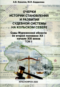 Ковалев, А. В. Очерки становления и развития судебной системы на Кольском Севере. Т. 2. Суды Мурманской области во второй половине XX – начале XXI веков : монография / А. В. Ковалев, Ю. П. Бардилева. – Красноярск : Научно-инновационный центр, 2020. – 413 с.: ил.