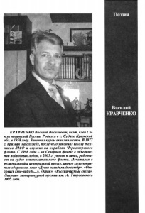 Поэзия Василий КРАВЧЕНКО КРАВЧЕНКО Василий Васильевич, поэт, член Со­ юза писателей России. Родился в г. Судаке Крымской обл. в 1958 году. Закончил курсы аквалангистов. В 1977 г. призван на службу, после чего закончил школу тех­ ников ВМФ и служил на кораблях Черноморского флота. С 1998 года - на Северном флоте в объедине­ нии подводных лодок, в 2005 г. уволен в запас, работа­ ет на судне вспомогательного флота. Печатался в региональной и центральной прессе, автор коллектив­ ных сборников, книг «Души невидимый костёр», «От­ зовись кто-нибудь...», «Крик», «России чистые снега». Лауреат литературной премии им. А. Твардовского 1995 года.