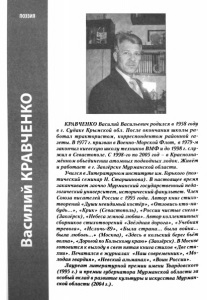 Василий КРАВЧЕНКО поэзия КРАВ ЧЕНКО Василий Васильевич родился в 1958 году в г. Судаке Крымской обл. После окончания школы р а ­ ботал трактористом, корреспондентом районной га­ зеты. В 1977г. призван в Военно-Морской Флот, в 1979-м закончил киевскую школу техников ВМФ и до 1998 г. слу­ жил в Севастополе. С 1998-го по 2005 год - в Краснозна­ мённом объединении атомных подводных лодок. Живёт и работает в г. Заозёрске Мурманской области. Учился в Литературном институте им. Горького (поэ­ тический семинар Н. Старшинова). В настоящее время заканчивает заочно Мурманский государственный педа­ гогический университет, исторический факультет. Член Союза писателей России с 1995 года. Автор книг стихо­ творений «Души невидимый костёр», «Отзовись кто-ни- будь...», «Крик» (Севастополь), «России чистые снега» (Заозёрск), «Небеса земной любви». Автор коллективных сборников стихотворений «Звёздная дорога», «Учебная тревога», «Ислочь-89», «Была страна... была война... была любовь...» (Москва), «Здесь в кольский берег бьёт волна», «Дорогой по Кольскому краю» (Заозёрск). В Москве готовится к выходу в свет пятая книга стихов «Две сти­ хии». Печатался в журналах «Наш современник», «Мо­ лодая гвардия», «Невский альманах», «Воин России». Лауреат литературной премии имени Твардовского (1995 г.) и премии губернатора Мурманской области за особый вклад в развитие культуры и искусства Мурман­ ской области (2004 г.).