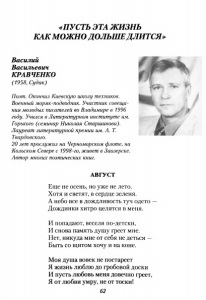 «ПУСТЬ ЭТА ЖИЗНЬ КАКМОЖНО ДОЛЬШЕДЛИТСЯ» Василий Васильевич КРАВЧЕНКО (1958, Судак) Поэт. Окончил Киевскую школу техников. Военный моряк-подводник. Участник совеща ния молодых писателей во Владимире в 1996 году. Учился в Литературном институте им. Горького (семинар Николая Старшинова). Лауреат литературной премии им. А. Т. Твардовского. 20 лет прослужил на Черноморском флоте, на Кольском Севере с 1998-го, живет в Заозерске. Автор многих поэтических книг. АВГУСТ Еще не осень, но уже не лето. Хотя и светят, в сердце зеленя. А небо все в дождливость туч одето — Дождинки хитро целятся в меня. И попадают, веселя по-детски, И снова память душу греет мне. Нет, никуда мне от себя не деться — Быть со щитом хочу и на коне. Моя душа вовек не постареет Я жизнь люблю до гробовой доски И пусть любовь меня довечно греет, Я от любви умру, не от тоски! 62 и М /