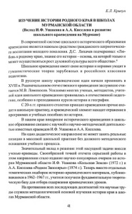 Е.Л. Крикун ИЗУЧЕНИЕ ИСТОРИИ РОДНОГО КРАЯ В ШКОЛАХ МУРМАНСКОЙ ОБЛАСТИ (Вклад И.Ф. Ушакова и А.А. Киселева в развитие школьного краеведения на Мурмане) В современной системе школьного исторического образования краеведение является важным средством гражданского патриотическо го воспитания молодого поколения. Д.С. Лихачев подчеркивал: «Лю бовь к родному краю, знание его истории - основа, на которой только и может осуществляться рост духовной культуры всего общества».6 Школьное краеведение имеет свою историю и корнями уходит в гуманистические теории зарубежных и российских классиков педагогики. В русскую школу краеведческие идеи начали проникать в ХѴШ в. Родоначальником отечественного краеведения заслуженно счи тается М.В. Ломоносов. Усилиями многих ученых, методистов, учите лей идея школьного краеведения прививалась в отечественной педаго гике, особенно в преподавании курсов истории и географии. С 20-х гг. прошлого столетия принцип краеведения прочно вхо дит в школьную практику, и краеведческий элемент находит отражение в программах и учебных пособиях по истории. В нашем крае внедрение исторического краеведения в школь ное образование связано с научной и научно-методической деятельнос тью известных краеведов И.Ф. Ушакова и А.А. Киселева. Ни одно дидактическое направление не может занять реальные позиции в массовой школьной практике без должного методического оснащения учебного процесса. Значительный вклад в решение этой насущной задачи внесли ученые-краеведы. Своеобразной точкой отсчета серьезной работы в этом направлении стало издание научно-популярных очерков по исто рии Мурманской области И.Ф. Ушакова «Кольская Земля» (1972 г.) и А.А. Киселева «Родное Заполярье» (1974 г.). Теперь вместо отдельных тематических подборок историко-краеведческого материала, публико вавшихся в 1962-1967 гг., учителя получили фундаментальную теорети ческую базу для отбора содержания краеведческих уроков. На протяжении всех последующих десятилетий эти научные тру ды служили методологической основой изучения истории края в шко лах Мурманской области. 41