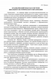 E.JJ . Крикун КРАЕВЕДЧЕСКИЙ МОДУЛЬ В СИСТЕМЕ ШКОЛЬНОГО ИСТОРИЧЕСКОГО ОБРАЗОВАНИЯ Краеведение - это широкая сфера культурно-просветительной, на учной, памятнико-охранительной деятельности не только ученых-специа- листов, но и всех местных жителей, включая школьников. Вместе с тем это специфическая область исторического знания и важный компонент содер жания гуманитарного образования. Издавна передовая педагогическая мысль стремилась обосновать необходимость использования местного материала в образовательно воспитательных целях. На рубеже ХХ-ХХІ вв. проблемы краеведения и регионализации школьного исторического образования вновь оказались в центре внимания педагогической общественности. Общепризнанным среди ученых-методи- стов стало положение о том, что школьники должны иметь сбалансиро ванное представление о событиях местной, региональной, национальной и всемирной истории. При этом именно материал местной, локальной исто рии содержит огромный потенциал для формирования гражданина, пат риота Отечества и своего края, активно способствует развитию интереса молодежи к своему историческому прошлому. Академик Д.С. Лихачев, говоря о значении краеведения в воспита нии граждан страны, справедливо отмечал, что чувство Родины нужно за ботливо взращивать, прививать духовную оседлость и если не будет кор ней в родной местности, в родной стороне - будет много людей, похожих на иссушенное растение перекати-поле1. В разряде дидактических проблем, пожалуй, самыми сложными и актуальными являются подходы к разработке моделей регионального ком понента содержания общего образования и связей краеведческого мате риала с содержанием базовых курсов истории. Этим проблемам посвящены исследования, как на общероссийском, так и на внутреннем региональном уровне (О.Ю. Стрелова, А.Е. Сейнен- ский, В.В. Дранишников, А.А. Штец и др.). Разработка универсальной модели регионального компонента со держания образования невозможна из-за его специфики в различных субъ ектах Российской Федерации. Поэтому педагогические сообщества в от дельных регионах и субъектах РФ идут своим путем. Дидактические модели совмещения регионального и федерального компонентов содержания исторического образования также разнообразны. В современной школьной практике используются такие варианты, как: 1 Сейненский А.Е. Родной край: страницы истории. В помощь педагогу-краеведу. - М.: Интерпракс, 1994. - С. 8. 198