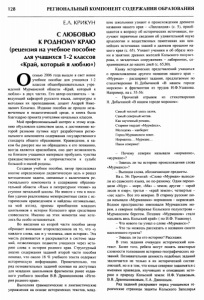 128 РЕГИОНАЛЬНЫЙ КОМПОНЕНТ СОДЕРЖАНИЯ ОБРАЗОВАНИЯ Е.А. КРИКУН С ЛЮБОВЬЮ К РОДНОМУ КРАЮ (рецензия на учебное пособие для учащихся 1-2 классов «Край, который я люблю») О сенью 2006 года вышло в свет новое учебное пособие для учащихся 1-2 классов общеобразовательных учре ждений Мурманской области «Край, который я люблю» в двух частях. Его автор-составитель - за ведующий кафедрой русского языка, литературы и методики их преподавания, доцент Андрей Нико лаевич Кохичко. Издание пособия не прошло неза меченным в педагогической среде, и книга была благодарно принята учителями начальных классов. Мой профессиональный интерес к этому изда нию обусловлен единством цели, к достижению ко торой разными путями идут разработчики регио нального компонента содержания государственного стандарта общего образования. Краеведение, в ка ком бы ракурсе мы ни обращались к его познанию, всегда является краелюбием, оно дает возможность на близком учащимся материале пробудить чувства гражданственности и сопричастности к судьбе большой и малой родины. Создавая учебное пособие, автор преследовал вполне определенную дидактическую цель и решал методические задачи, связанные с включением ре гионального компонента в содержание образова тельной области «Язык и литературное чтение» на ступени начальной школы. Но вместе с тем в посо бии удачно реализованы межпредметные связи с ис торическим краеведением и найдены оптимальные, на мой взгляд, приемы приобщения младших школьников к истории Кольского края средствами словесности. Именно на этих моментах мне хоте лось бы особо остановиться. Во введении ко второй части пособия автор обращает внимание второклассников на то, что «у каждого слова, как и у человека, своя история». Эта мысль развивается и раскрывается в системе зада ний, позволяющих подвести учащихся через исто рию слова к истории родного края. Структурный анализ содержания заданий второй части пособия показал, что около 18 % учебного текста содержит историческую информацию. Примечательно, что ряд познавательных заданий основан на доступных для младших школьников фрагментах ранее издан ного учебного пособия В.В. Дранишникова «Исто рия родного края». Выполняя грамматические и лингвистические упражнения на основе исторических текстов, млад шие школьники узнают о происхождении древнего названия нашего края - «Лапландия» (с. 5), приоб щаются к вопросу об исторических источниках, по лучают первичные сведения об удивительной науке археологии и вещественных памятниках как цен нейших источниках знаний о далеком прошлом на шего края (с. 65). Узнают ученики и об образе жиз ни и занятиях древних жителей Кольского полуост рова, о загадочных сооружениях - лабиринтах, со хранившихся до наших дней (с. 65,80). Канву исторических представлений учащихся о происхождении другого названия нашего края - «Мурман» - расширяют задания, предлагаемые по стихотворению Н. Добычиной «В нашем городе морском» и фрагментам из трудов И.Ф.Ушакова. Например, на с. 55-56: - Прочитай отрывок из стихотворения Н. Добычиной «В нашем городе морском»: Самый теплый здесь залив. Самый северный мотив. Как заученный романс, Старики твердят «Мурманск», Молодежь - наоборот Город Мурманском зовет. Норманны... Мурмане... Наши северяне! - Почему северян называли «норманне», «мурмане»? - Знаешь ли ты историю про