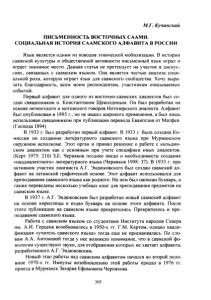 М.Г. Кучинский ПИСЬМЕННОСТЬ ВОСТОЧНЫХ СААМИ. СОЦИАЛЬНАЯ ИСТОРИЯ СААМСКОГО АЛФАВИТА В РОССИИ Язык является одним из поводов этнической мобилизации. В истории саамской культуры и общественной активности письменный язык играл и играет значимое место. Данная статья не претендует на участие в дискус­ сиях, связанных с саамским языком. Она является частью анализа соци­ альной роли, которую играет язык для саамского сообщества. Хочу выра­ зить благодарность, всем моим респондентам, участникам описываемых событий. Первый алфавит для одного из восточно-саамских диалектов был со­ здан священником о. Константином Щеколдиным. Он был разработан на основе печенгского и мотовского говоров Нотозерского диалекта. Алфавит был опубликован в 1895 г., но не нашел широкого применения, а был лишь использован священником при публикации перевода Евангелия от Матфея. (Господа 1894) В 1933 г. был разработан первый алфавит. В 1933 г. была создана Ко­ миссия по созданию литературного саамского языка при Мурманском окружном исполкоме. Этот орган и принял решение о работе с кильдин- ским диалектом как с основным при учете специфики иных диалектов. (Керт 1975: 210) З.Е. Черняков позднее писал о необходимости создания «наддиалектного» литературного языка (Черняков 1998: 37). В 1933 г. при активном участии лингвиста А.Г. Эндюковского был создан саамский ал­ фавит на латинской графической основе. Этот алфавит использовался для преподавания саамского языка как родного. На нем был написан букварь, а такж е переведены несколько учебных книг для преподавания предметов на саамском языке. В 1937 г. А.Г. Эндюковским был разработан новый саамский алфавит на основе кириллицы и издан букварь на основе этого алфавита. После этого публикации на саамском языке прекратились. Прекратилось и пре­ подавание саамского языка. Работа с саамским языком со студентами Института народов Севера им. А .И . Герцена возобновилось в 1950-х гг. Г.М. Кертом, однако квали­ фикация «учитель саамского языка» тогда еще не присваивалась. По сло­ вам А.А. Антоновой тогда у нее возникло понимание, что в саамской фо­ нологии существуют звуки, для отображения которых не хватает алфавита, разработанного А.Г. Эндюковским. Новый этап работы над саамским алфавитом начался во второй поло­ вине 1970-х гг. Импульс возобновлению этой работы придал в 1976 гг. приезд в Мурманск Захария Ефимовича Чернякова. 305