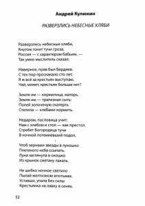 Андрей Кулюкин РАЗВЕРЗЛИСЬ НЕБЕСНЫЕ ХЛЯБИ Разверзлись небесные хляби, Кнутом гонит тучи гроза. Россия — с характером бабьим, — Так умно мыслитель сказал. Наверное, прав был Бердяев. С тех пор проскакало сто лет, Я ж всё за крестьян выступаю. Чай, может, крестьян больше нет? Земля им— кормилица, матерь. Земля им — трапезная сыть: Полей золоченую скатерть Стелила — хлебами кормить. Недаром, пословица учит: Нам с хлебом и стол — как престол. Сгребет Богородица тучи В ночной потемневший подол, Чтоб зернами звезды в лукошко Плетеного неба ссыпать. Луна заглянула в окошко Из крынок сметану лакать. Не шибко ночное светило Пылай желтизною впотьмах. Уставши, упала без силы Крестьянка на лавку в сенях. 52