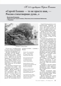 «Сергей Есенин — то не просто имя России стихотворная душа...» Валентина Кузнецова, директор музея Сергея Есенина, Областная детско-юношеская библиотека, г. Мурманск Памятник С.Есенину в Рязани В этом году 3 октября русско му поэту Сергею Александрови чу Есенину исполнилось 115 лет. Две даты: 3 октября 1895 года— 28 декабря 1925 года. Первая — дата рождения, вторая — смерти поэта. 30 прожитых на этой зем ле лет... Много это или мало? В Закавказье, где Есенин не раз бы вал, в старину говорили: 30 лет человек должен учиться, 30 путе шествовать и 30 писать, расска зывая людям все, что он увидел, узнал, понял. Есенину было отпущено в три раза меньше. Его судьба — под тверждение другого старого из речения: «Жизнь ценится не за длину». Незадолго до гибели поэт признавался: «Ведь я мог дать не то, что дал». Но и то, что он дал, — это очень много, это целый мир, он живет, движет ся, переливается всеми цветами радуги. Это задушевная песнь о великом и вечном — о родине, о России: Гой ты, Русь, моя родная, Хаты — в ризах образа... Не видать конца и края - Только синь сосет глаза. Как захожий богомолец, Я смотрю твои поля. А у низеньких околиц Звонно чахнут тополя. Пахнет яблоком и медом По церквам твой кроткий Спас. II гудит за корогодам На лугах веселый пляс. Побегу по мятой стежке На приволь зеленыхлех, Мне навстречу, как сережки, Прозвенит девичий смех. Если крикнет рать святая: «Кинь ты Русь, живи враю!»- Я скажу: «Не надорая, Дайте родину мою». Сергей Есенин родился в селе Константиново Рязанской во лости в крестьянской семье. Он считал себя певцом русской де ревни: «все равно остался я поэ том золотой бревенчатой избы». Родина, Россия была для Есе нина началом всех начал. Даже имя ее он произносил с восхище нием: «Россия... Какое хорошее слово... и «роса», и «сила», и «си нее» что-то...». О жизни поэта написаны тыся чи книг и статей. И все-таки о его жизни, думах и переживаниях ни кто и никогда не расскажет так полно, глубоко и впечатляюще, как это сделал он сам. Его лири ческая повесть о себе и своем вре мени предельно искренна и прав дива. К себе он был беспощаден, «себя вынимал наиспод», он сам признается: «Стихи мои, спокойно расскажите про жизнь мою». Име ющий глаза — да увидит, имею щий уши — да услышит. Деревенский мальчик, «жел товолосый, с голубыми глаза ми», который тогда «впервые с рифмой... схлестнулся, от сон ма чувств вскружилась голова», сказал себе: «Всю душу выплес ну в слова». Кудрявый и веселый юноша, бросающий со сцены упругие и размашистые слова: «Взвихрен ной конницей рвется к новому берегу мир». Человек, потерявший опору под ногами, растерянно взираю щий на движение жизни: «Куда несет нас рок событий?..» Зрелый мастер, ясно осозна ющий свое призвание: «Хочу я быть певцом и гражданином». Под сенью Трифона | №1 Январь 2011 63