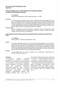 DOI:10.37614/2307-5228.2020.12.2.002 УДК 903.27 ГОРНЫЕ ПОРОДЫ СКАЛ С ПЕТРОГЛИФАМИ НА ОСТРОВАХ КАНОЗЕРА: ИСТОРИЯ И ПЕРСПЕКТИВЫ ИЗУЧЕНИЯ В. А. Лихачёв МАУК Музей-заповедник «Петроглифы Канозера», пгт. Умба Аннотация На скалах островов оз. Канозера начиная с 1997 г. выявляются петроглифы, датируемые 3-2 тыс. до н. э. Изучение физических и химических свойств горных пород, на которых выбиты петроглифы, важно для понимания скорости разрушения петроглифов, разработки методов изучения их хро­ нологии и периодизации, а также для нахождения эффективных способов их консервации. В ста­ тье рассматривается история изучения горных пород скал островов оз. Канозера, которые прово­ дились с 1920-х по 1960-е гг. в ходе ряда геологических экспедиций. Ключевые слова: Кольский полуостров, Канозеро, петроглифы, наскальные рисунки, Фенноскандия, горные породы, метаперидотиты, метапироксениты, наскальное искусство, объект культурного наследия, история геологических исследований. ROCK FORMATIONS WITH PETROGLYPHS ON THE KANOZERO ISLANDS: HISTORY AND PROSPECTS OF STUDY V. A. Likhachev Museum-Reserve "The Kanozero Petroglyphs", Umba Abstract: The Kanozero Petroglyphs dating back to 3-2 thousand BC have been identified on the rocks of the Ka­ nozero Islands since 1997. The study of the physical and chemical properties of rocks on which petro­ glyphs are carved is important for understanding the rate of destruction of petroglyphs, developing methods for studying their chronology and periodization, as well as effective methods of their conserva­ tion. The article deals with the history of studying of the Kanozero Islands rocks, which were carried out from the 1920s to the 1960s during a number of geological expeditions. Keywords: cultural heritage object, rock carvings, petroglyphs, rocks, metaperidotite, metapyroxenite, Fen- noscandia, Kola Peninsula, Kanozero. Введение Наскальные рисунки Канозера расположены на островах оз. Канозера в южной части Кольского полуострова. Наряду со скоплениями в пунктах Альта, Немфорсен, Винген, Беломорск и на берегах Онежского озера, где количество выявленных петроглифов превышает 1000, наскальные рисунки Канозера относятся к крупным скоплениям петроглифов «охотничьей традиции» Фенноскандии [Gjerde, 2010; Колпаков, Шумкин, 2012 и др.] (рис. 1). Петроглифы Канозера датируются в диапазоне V -II тыс. до н. э. [Колпаков, Шумкин 2012: 350] и связаны с эпохой позднего неолита и раннего металла на Кольском полуострове. Петроглифы Канозера были обнаружены во время экспедиции краеведческого музея Ловозерского ГОКа (пос. Ревда) в 1997 г. волонтером музея Юрием Ивановым [Иванов, 2001; Лихачёв, 2001, 2011; Likhachev, 2018] (рис. 2). ВЕСТНИК Кольского научного центра РАН 2/2020 (12) 15
