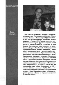 Бывальщина Свен ЛОККО JIOKKO Свен Петрович, писатель, публицист, художник, член Союза писателей России. Родился на хут. Куклино в Кольскомр-не Мурманской обл. в 1924 году в семье финского колониста, пересе лившегося в Россию в 1918. Работал полеводом, заве довал молочно-товарной фермой в с. Тулома. В 1940 выслан с земляками-финнами в Карелию. В годы Великой Отечественной войны направлен на прину дительный труд в Челябинский ГУЛАГ, в условиях ограничения свободы работал каменщиком, печни ком. В послевоенное время - лесовод, шофёр, пере водчик на строительстве Верхнетуломской ГЭС, председатель Верхнетуломского поселкового Совета. Закончил курс рисования и живописи Московского народного университета им. Крупской. В 1963-1969 учился в Мурманском высшем инженерном морском училище. Пишет на финском языке. Первые рассказы опубликовал в журнале «Пуналиппу» («Красное зна мя», Петрозаводск) в 1970 году. В 1987-м там же опубликован роман «Люди Ледовитого», в 1989 - повесть «Наедине с совестью». В 1991-1993 г.г. в из дательстве «Карелия» вышли книги «Полярная ночь и свет», «Тепло Лапландии в сердце», в Мурманске - роман-трилогия «Финны на Мурмане» (на русском и финском языках).