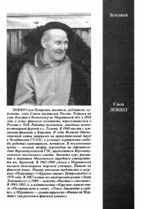 Земляки JIOKKO Свен Петрович, писатель, публицист, ху дожник, член Союза писателей России. Родился на хут. Куклино в Кольскомр-не Мурманской обл. в 1924 году в семье финского колониста, переселившегося в Россию в 1918. Работал полеводом, заведовал молоч- но-товарной фермой в с. Тулома. В 1940 выслан с зем- ляками-финками в Карелию. В годы Великой Отече ственной войны направлен на принудительный труд в Челябинский ГУЛАГ, в условиях ограничения свобо ды работал каменщиком, печником. В послевоенное время — лесовод, шофёр, переводчик на строитель стве Верхнетуломской ГЭС, председатель Верхнету- ломского поселкового совета. Закончил курс рисова ния и живописи Московского народного университе та им. Крупской. В 1963-1969 учился в Мурманском высшем инженерном морском училище. Пишет на финском языке. Первые рассказы опубликовал в жур нале «Пуналипну» («Красное знамя», Петрозаводск) в 1970 году. В 1987-м тамже опубликованроман «Люди Ледовитого», в 1989—повесть «Наедине с совестью». В 1991-1993 гг. в издательстве «Карелия» вышли кни ги «Полярная ночь и свет», «Тепло Лапландии в серд це», в Мурманске — роман-трилогия «Финны на Мур мане» (на русском и финском языках). Свен ЛОККО