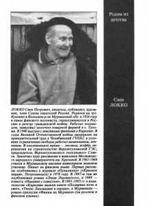 Родом из детства Свен локко ЛОККО Свен Петрович, писатель, публицист, худож ник, член Союза писателей России. Родился на хут. Ку клино в Кольском р-не Мурманской обл. в 1924 году в семье финского колониста, переселившегося в Рос сию в разгар гражданской войны. Работал полево дом, заведовал молочно-товарной фермой в с. Туло- ма. В 1940 выслан с земляками-финнами в Карелию. В годы Великой Отечественной войны направлен на принудительный труд в Челябинский ГУЛАГ, в усло виях ограничения свободы работал каменщиком, печ ником. В послевоенное время — лесовод, шофёр, пе реводчик на строительстве Верхнетуломской ГЭС, председатель Верхнетуломского поселкового Сове та. Закончил курс рисования и живописи Московско го народного университета им. Крупской. В 1963-1969 учился в Мурманском высшем инженерном морском училище. Пишет на финском языке. Первые расска зы опубликовал в журнале «Пуналиппу» («Красное знамя», Петрозаводск) в 1970 году. В 1987-м там же опубликован роман «Люди Ледовитого», в 1989 — повесть «Наедине с совестью». В 1991-1993 гг. в изда тельстве «Карелия» вышли книги «Полярная ночь и свет», «Тепло Лапландии в сердце», в Мурманске — роман-трилогия «Финны на Мурмане» (на русском и финском языках).
