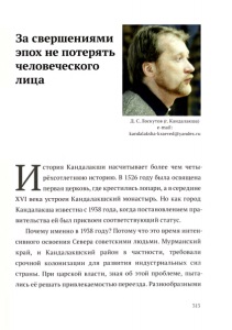 За свершениями эпох не потерять человеческого лица Д. С. Лоскутов (г. Кандалакша) e-mail: kandalaksha-kraeved@yandex.ru И стория Кандалакши насчитывает более чем четы рёхсотлетнюю историю. В 1526 году была освящена первая церковь, где крестились лопари, а в середине XVI века устроен Кандалакшский монастырь. Но как город Кандалакша известна с 1938 года, когда постановлением пра вительства ейбыл присвоен соответствующий статус. Почему именно в 1938 году? Потому что это время интен сивного освоения Севера советскими людьми. Мурманский край, и Кандалакшский район в частности, требовали срочной колонизации для развития индустриальных сил страны. При царской власти, зная об этой проблеме, пыта лись её решать привлекаемостью переезда. Разнообразными 313