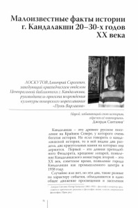 Малоизвестные факты истории г. Кандалакши 20 - 30 -х годов XX века ЛОСКУТОВДмитрий Сергеевич, заведующий краеведческим отделом Центральной библиотеки г. Кандалакши, руководитель проекта возрождения культуры поморского мореплавания «Путь Барлаама» Народ, забывающий свою историю, обречен её повторить. Джордж Сантаяна1 Кандалакша - это древнее русское посе­ ление на Крайнем Севере, у которого очень богатая история. Но если говорить о Канда­ лакшской истории, то в ней видны два раз­ дела, два краеугольных камня на которых она держится. Первый - это деяния преподоб­ ного Феодорита, крещение лопарей, появле­ ние Кандалакшского монастыря; второй - это XX век, советское время, появление города Кандалакши как промышленного центра в 1938 году. Случайно или нет, но эти два, такие разные по характеру события, объединяются в одно общее движение просвещения и заселения 1 Джордж Сантаяна (George Santayana) (1863-1952) - философ и литератор, пред­ ставитель критического реализма и философии жизни, классик американской философии. (Прим. ред). 71