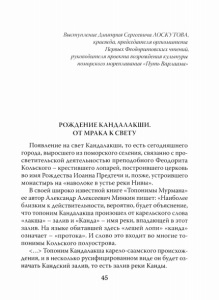 ВыступлениеДмитрия Сергеевича ЛОСКУТОВА, краеведа, председателя оргкомитета Первых Феодоритовских чтений, руководителя проекта возрождения культуры поморского мореплавания «Путь Варлаама» РОЖДЕНИЕ КАНДАЛАКШИ. ОТ МРАКА К СВЕТУ Появление на свет Кандалакши, то есть сегодняшнего города, выросшего из поморского селения, связанно с про светительской деятельностью преподобного Феодорита Кольского - крестившего лопарей, построившего церковь во имя Рождества Иоанна Предтечи и, позже, устроившего монастырь на «наволоке в устье реки Нивы». В своей широко известной книге «Топонимы Мурмана» ее автор Александр Алексеевич Минкин пишет: «Наиболее близким к действительности, вероятно, будет объяснение, что топоним Кандалакша произошел от карельского слова «лакша» - залив и «Канда» - имя реки, впадающей в этот залив. На языке обитавшей здесь «лешей лопи» «канда» означает - «протока». И слово это входит во многие то понимы Кольского полуострова. <...> Топоним Кандалакша карело-саамского происхож дения, и в несколько русифицированном виде он будет оз начать Кандский залив, то есть залив реки Канды. 45