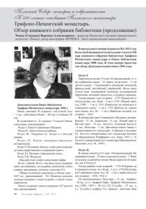 (K0ymc5KuaTpe£^Ji:aemopu&,uco£./iei№et{<Hoicm4> &CU80-лтмюаохшВшшш^Пё&сншкоо'йО'м Трифоно-Печенгский монастырь. Обзор книжного собрания библиотеки (продолжение) Мацак (Сокурова) Вероника Александровна - директор Печенгского историко-краеведческого музея (пос. Никель), автор монографии «ПЕЧЕНГА. Опыт краеведческой энциклопедии». Дополнительная Опись библиотеки Трифоно-Печенгского монастыря. 1896 г. Опись занимает 89 страниц ( титульный лист - 1 стр., собственно Опись - 88 стр.), отмечено 48 стр. В оглавлении (с. 2) указаны 7 отделов Описи следующих наименований: Отдел I. Книги Священнаго Писания. Отдел II. Книги Богослужебныя. Отдел III. Творения Св. Отцев и учителей церкви. Отдел IV. Книги священно-церковно- историческия. ОтделV. Поучения, беседы, слова, речи и прочия духовно-нравственнаго содержания книги. Отдел VI. История, гражданская смесь. Отдел VII. Журналы. Каждый отдел имеет следующие графы: № п/п - общий, № п/п - внутри отдела, названия книг, где печатаны, год издания, количество экзем пляров, примечание, отметка о наличии (V). Общее количество внесённых в Опись книг - 1007 экз., наименований - 741. Имеются дополни тельные сведения о языке издания, а также о виде переплётов. Опись содержит список журналов 347 различ ных наименований. В предыдущем номере журнала (№3, 2012 год) была опубликована вступительная статья к Об зору книжного собрания библиотеки Трифоно- Печенгского монастыря и Опись библиотеки монастыря 1888 года. В этом номере представ лен обзор Дополнительной описи 1896 года. Отдел I. Перечень включает 50 книг 40 наименований, в т.ч. на славянском языке - 21 книга, на русском - 9, на других языках - 5 (греческий и латинский, немецкий, французский, английский, еврейский). Виды пере плетов книг: шагреневый тисненый, коленкоровый, бархатный, кожаный переплеты, в кожаном корешке. Самые ранние годы издания - 1737 (Евангелие и Апостольник, изд. Киев - 2 кн.); 1740 (Новый завет, изд. СПб. - 1 кн.); 1761 (Евангелие на греческом и славянском языке - 1 кн.); 1762 (Библия на славян ском языке, изд. М. - 1 кн.). Наиболее поздний год издания - 1904. В репертуаре книг Священного Писания указаны: Библия - 11 экз., Евангелие - 12 экз., Новый завет и Ветхий завет - 10 экз., Апостол, Толковый Апостол - 6 экз., Псалтирь - 1 экз. Две книги имеют запись о пожертвовании их монастырю: 1) Деяния и послания Св. Апостол пожертвована сего монастыря Казначе ем Иеромонахом Порфирием, изд. Киев, 1891 г.; 2) Апостол пожертвован сего монастыря Иеродиаконом Пахомием, изд. М., 1898 г. Отдел II. В списке значится 211 книг 168 наименований. На славянскомязыке - 35 книг, на русскомязыке - 7. Язык остальных изданий не указан. Виды переплетов такие же, как в Отделе I. Самые ранние годы изданий - 1770 (Сборник на Славянским языке, изд. Киев - 1 кн.); 1758 (Псалтирь на Славянском языке, изд. М. - 1 кн.); наиболее позд ние издания - 1900, 1902 гг. По наименованиям: Псалтири - 21 экз., Акафист - 18 экз., в т.ч. Акафист Преп. Трифону Печенгскому, изд. СПб., 1897 г., № п/п 122; Службы - 27 экз., в т.ч. Служба и акафист Св. праведн. Артемию Вер- 50 Под сенью Трифона | №4 2012