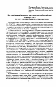 Макарова Елена Ивановна, канди дат исторических наук, заведующая архивом Кольского научного центра РАН Научный архив Кольского научного центра Российской академии наук как источниковая база по истории региона Научный архив Кольского научного центра Российской академии наук (НА КНЦ РАН) - хранилище ценнейших материалов поисковых экспеди ций и научных исследований в Евро-Арктическом регионе Академии наук - создавался в процессе становления и развития Кольского научного центра, отметившего свое 70-летие в 2000 году. В архивных фондах сосредоточены богатые картографические ма териалы, дневники полевых работ экспедиций, рукописи научных ра бот, аудиовизуальные и управленческие документы, освещающие в ди намике историю Хибинской горной станции Академии наук (ХИГС, 1930-1932 гг.), Кольской базы АН СССР (КБАН, 1932-1949 гг.), Кольско го филиала АН СССР (КФАН, 1949-1988 гг.), Кольского научного цент ра АН СССР (КНЦ, 1988-1991 гг.), Кольского научного центра Российс кой академии наук (КНЦ РАН, с 1991г.). Сохранностью этих документов мы обязаны, прежде всего, академику А.Е. Ферсману, создавшему с группой ученых-энтузиастов первый в научной практике периферий ный исследовательский центр Академии наук стационарного типа за Полярным кругом. Как ученый он отлично понимал все значение полу ченных первичных и аналитических данных, накапливаемых в ходе эк спедиционных и камеральных работ начального периода изучения и освоения богатств Кольского полуострова. Будучи еще и прекрасным администратором, А.Е. Ферсман в годы первых пятилеток в СССР, на правленных на подъем экономики страны, заложил основы структуры управления научной деятельностью и информационного обеспечения в Хибинской горной станции (1930 г.) - Кольской базе АН СССР(1934- 1949 гг.). Достаточно вспомнить переданную им в дар «Тиетте», как он назвал свое детище, научную библиотеку в 6000 книг, ставшую ядром последующей богатейшей коллекции научной мысли, исчисляющуюся ныне 500000 ед.хр. Столь же основательно он способствовал сохране нию и упорядочению ретроспективной документации основной и уп равленческой деятельности, формируя архивный фонд Станции-Базы, а также свой личный фонд (передан родственниками в Архив РАН в Москве). В соответствии с «Положением об архивохранилищах филиалов и баз АН», утвержденным 4 июня 1933г.1 ученым секретарем А.М. Оран- жиреевой, архивные документы были собраны в 1935 г. в составе «науч ного архива материалов по Кольскому полуострову», за что ученый сек 18