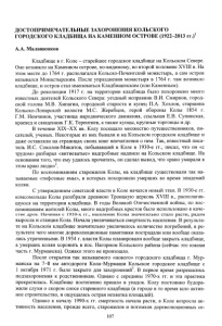 ДОСТОПРИМЕЧАТЕЛЬНЫЕ ЗАХОРОНЕНИЯ КОЛЬСКОГО ГОРОДСКОГО КЛАДБИЩА НА КАМЕННОМ ОСТРОВЕ (1922-2013 гг.)1 А.А. Малашенков Кладбище в г. Коле - старейшее городское кладбище на Кольском Севере. Оно возникло на Каменном острове, по-видимому, во второй половине XVIII в. На этом месте до 1764 г. располагался Кольско-Печенгский монастырь, а сам остров назывался Монастырским. После упразднения монастыря в 1764 г. там возникло кладбище, и остров стал именоваться Кладбищенским (или Каменным). До революции 1917 г. на территории кладбища было похоронено много известных деятелей Кольского Севера: уездный исправник В.И. Смирнов, город ской голова М.В. Хипагин, городской староста и купец П.А. Хохлов, старшина Кольско-Лопарской волости М.С. Жеребцов, герой обороны Колы 1854 г. Г.М. Немчинов, участница народнического движения, ссыльная Е.В. Супинская, краевед и священник Г.К. Терентиев, а также купцы, крупные торговцы и др. В течение ХІХ-ХХ вв. Колу посещало множество путешественников, пи сателей, ученых. Некоторые из них бывали и на Кольском городском кладбище и даже оставляли на страницах своих книг впечатления о нем. Так, известный писа тель И.С. Соколов-Микитов, побывавший в Коле в 1930-е гг., писал, что он «с трудом» разбирал «витиеватые» надгробные надписи на Кольском кладбище. На основании того, что ему удалось прочитать, он сделал вывод, что «рано умирали в этом краю люди»2. По воспоминаниям старожилов Колы, на кладбище существовали так на зываемые «тифозные ямы», в которых похоронили умерших во время эпидемий колян. С утверждением советской власти в Коле начался новый этап. В 1930-е гг. комсомольцы Колы разобрали древнюю Троицкую церковь XVIII в., располагав шуюся на территории кладбища. В годы Великой Отечественной войны, по вос поминаниям жителей Колы, много надгробных крестов было использовано в каче стве др о в . Н а ч и н а я с 1930-х гг., н а с е л е н и е К о лы зн а ч и т е л ь н о с т а л о р ас ти , р яд ом выросла и станция Кола. Начала увеличиваться смертность населения. В результа те на Кольском кладбище значительно увеличилось количество погребений, в ре зультате чего многие дореволюционные памятники пострадали или вообще оказа лись утраченными. В 1954 г. власти Колы планировали вообще закрыть кладбище, а умерших колян хоронить в пос. Нагорном Кольского района (сейчас это южная часть г. Мурманска). Однако этого не произошло. После открытия так называемого «нового» городского кладбища г. Мур манска на 7-8 км автодороги Кола-Мурмаши Кольское городское кладбище с 1 октября 1971 г. было закрыто для захоронений3. В первое время разрешались подзахоронения к родственникам. Однако с середины 1970-х гг. и эта практика прекратилась. Кладбище постепенно пришло в упадок. Колу постоянно будора жили слухи о скором сносе старинного кладбища (в городе в то время шло актив ное строительство, и ощущалась острая нехватка площадей). Однако к началу 1990-х гг. смертность начала расти, в Коле возросла ак тивность населения, прежде всего, старожилов и потомков дореволюционных се 107