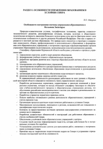 РАЗДЕЛ I. ОСОБЕННОСТИ УПРАВЛЕНИЯ ОБРАЗОВАНИЕМ В УСЛОВИЯХ СЕВЕРА В.П. Манухин Особенности построения системы управления образованием в Кольском Заполярье Природно-климатические условия, географическое положение, характер социально- экономического развития, демографическая ситуация, история, культура и общественно- политическая активность населения Кольского полуострова и ряд других факторов имеют свои отличительные особенности от других регионов Российской Федерации. Они как в зеркале от­ ражаются в местной системе образования. Это прежде всего относится к структуре и содержа­ нию дошкольного, общего, профессионального и дополнительного образования, к формирова­ нию сети образовательных учреждений, к построению структуры и функционированию органов управления образованием на региональном, муниципальном и институциональном уровнях. Специфику образования Мурманской области необходимо учитывать в процессе управ­ ления при: 1) определении стратегии, целей и задач развития образования; 2) формировании учебных планов и образовательных программ; 3) разработке программ развития всех структур образовательной системы области на всех уровнях; 4) планировании сети образовательных учреждений; 5) проектировании потребности и распространении финансовых и материальных ресурсов; 6) определении источников обеспечения образования педагогическими и руководящими кадрами; 7) организации научно-технического обеспечения педагогического процесса; 8) решении вопросов охраны здоровья детей и педагогов. В управленческой деятельности руководящих работников на всех уровнях в Мурман­ ской заполярной области повышается значимость таких управленческих процедур: - Разработка региональных нормативов, корректировка и внесение изменений в феде­ ральные нормативы, которые не всегда учитывают специфику Заполярья по обеспече­ нию учебно-воспитательного процесса в образовательных учреждениях региона, что обусловлено российским законодательством о льготах для северян и региональными за­ тратами на образовательные услуги в регионе. - Разработка и принятие нормативно-правовых актов. - Поиски наиболее оптимального режима деятельности образовательных учреждений с учетом времени года. - Организация процесса адаптации педагогических работников к условиям Севера. - Максимальное использование, имеющихся в регионе, возможностей для повышения и квалификации педагогических кадров. - Контроль за предоставлением местными органами самоуправления установленных за­ конами льгот северянам. - Разработка должностных обязанностей и инструкций для работников образования с учетом особенностей Севера. - Обеспечение устойчивой связи образовательных учреждений с центром. - Создание такой системы информирования педагогов, которая действовала бы в экстре­ мальных условиях без перебоев. - Установление дополнительных штатов для выполнения работ, связанных с экстремаль­ ными условиями Севера. - Принятие мер по закреплению педагогических кадров на Севере и устранению отрица­ тельных последствий частой их сменяемости. 4
