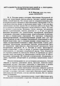 АКТУАЛЬНОСТЬ ПЕДАГОГИЧЕСКИХ ИДЕЙ М. А. ПОГОДИНА В РАЗВИТИИ ОБРАЗОВАНИЯ В. П. Манухин, канд. пед. наук, доцент МОИПК РО М. А. Погодин вошел в историю образования Мурманской об ласти как т алан тливый учитель-новатор, методист высшей квалифи кации, ученый-практик. Его смелые идеи по совершенствованию учеб- но-воспнтателыіоі о процесса в образовательных учреждениях в 50-70-е годы были известны далеко за пределами нашего края. У него нет фун даментальных научных трудов. Все его печатные работы (их более 100) ость в основном описание передового педагогического опыта. Это кни ги местного издательства, брошюры , статьи , доклады , методические письма и рекомендации, заметки, рецензии и т. д. В них не простая фиксация интересных дел, увлекательных мероприятий, проводимых отдельными учителями, воспитателями, педагогическими коллектива ми школ и внешкольных учреждений. Это тщательно отобранный, проанали зированный , систематизированный лучший опыт того вре мени. Осмыслен он к а к с позиции классической отечественной и зару бежной педагогики, т а к и с позиции ведущих ученых-педагогов, с п о зиции государственной политики в сфере образования. Советы, реко мендации, предложения, наставления учителям, руководителям школ по повышению эффективности образовательной деятельности были востребованы практикой. М. А. Погодин не искал “философского камня в педаг огике” , а шел от жизни, от реально существующей дей ствительности, от насущных потребностей школы. Этим объясняется ого огромное влияние на учительство области. В апробащ іи его ориги нальных идей участвовало по официальным отчетам более 50 обр азо вательных учреждений, 300 учителей и воспитателей, объединенных в девять творческих л абораторий по различным направлениям педаго гики. Мног ие нововведения тех лет не потеряли актуальность. Сегодня эйфория от перемен, охвативших школу, проходит. Ажиотаж вокруг инноваций затухает. Наступает успокоение от перестроек, в органах управления началась пора осмысления происходящих процессов. Как и при всех ранее проводимых школьных реформах рушатся надежды на скорое получение видимых результатом. А видим мы их сего;іня у отдельных учителей, у некоторых образовательных учрежде ний скорее как исключение, а не как массовое явление. Все это законо мерно и объяснимо. За существенными, принципиальными, порой эффектными о р г а низационными изменениями в практике обучения и воспитания детей 3