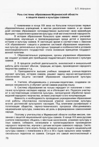 В.П. Манухин Роль системы образования Мурманской области в защите языка и культуры саамов С появлением в конце XIX века на Кольском полуострове первых образовательных учреждений, в местах расселения саамов, и до наших дней система образования непосредственно выполняет свою важнейшую функцию-сохранение и развитие культуры этой малочисленной народности. В истории образования Кольского края немало имеет учителей- подвижников, изучающих и пропагандирующих среди детей и взрослых историю и культуру саамов. В настоящее время в соответствии с Законом «Об образовании» «защита и развитие системой образования националь ных культур, региональных культурных традиций и особенностей в условиях многонационального государства» стала основным принципом государст венной политики. 1. Образовательные учреждения, органы управления образовани ем создают условия для приобщения подрастающего поколения к культуре саамов. 2. В процессе учебной деятельности, внеклассной и внешкольной работы дети изучают обычаи, традиции, историю, произведения народного творчества саамов и т.д. 3. Преподаватели высших учебных заведений, ученые-педагоги изучают культуру, историю саамов, решают задачу научно-методического обеспечения защиты системой образования национальной культуры саамов. 4. Учителя, объединившись с учеными-педагогами, создавали са амскую письменность и обучают детей саамов родному языку. 5. Система образования не только передает от поколения к поко лению культурное наследие народа, но и обогащает его. Педагоги участву ют в систематизации элементов культуры, литературной обработке произ ведений народного творчества, активно участвуют в его популяризации. Важность и необходимость проведения учреждениями образования этой работы обусловлена постепенной утратой носителями культуры многих достижений культурного наследия. Под влиянием русификации и политизации общества, научно-технического прогресса обесценивалась национальная культура, снижалась её роль в формировании самосознания народа. Поэтому у учительства в Мурманской области особая миссия, свя занная с защитой национальной культуры саамов. В конце XIX века русские учителя повседневно общаясь с местным населением, усваивая культуру и язык саамов, собирали, записывали и пропагандировали произведения народного творчества, изучали с детьми историю саамского народа. Систе ма образования стала играть более активную роль в защите национальной культуры саамов с появлением в 20-х и 30-х годов прошлого века профес сиональных педагогов из саамов. Сегодня это самый многочисленный и 76