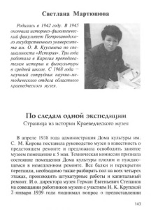 Светлана Мартюшова Родилась в 1942 году. В 1945 окончила историко-филологичес кий факультет Петрозаводско го государственного университе та им. О. В. Куусинена по спе циальности «История». Три года работала в Карелии преподава телем истории и физкультуры в средней школе. С 1968 года — научный сотрудник научно-ме тодического отдела областного краеведческого музея. По следам одной экспедиции Страница из истории Краеведческого музея В апреле 1938 года администрация Дома культуры им. С. М. Кирова поставила руководство музея в известность о предстоящем ремонте и предложила освободить занятое музеем помещение к 5 мая. Техническая комиссия признала состояние помещения Дома культуры плохим и нуждаю щемся в немедленном ремонте. Все балки и перекрытия перегнили, необходимо также разбирать пол на всех четырех этажах, производить штукатурные работы и капитальный ремонт. И.о. директора музея Герман Евгеньевич Степанов на совещании работников музеев с участием Н. К. Крупской 2 января 1939 года поднимал вопрос о предоставлении 143