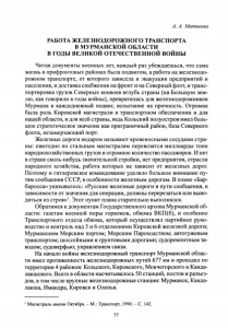 А. А. Матвеева РАБОТА ЖЕЛЕЗНОДОРОЖНОГО ТРАНСПОРТА В МУРМАНСКОЙ ОБЛАСТИ В ГОДЫ ВЕЛИКОЙ ОТЕЧЕСТВЕННОЙ ВОЙНЫ Читая документы военных лет, каждый раз убеждаешься, что сама жизнь в прифронтовых районах была подвигом, а работа на железнодо рожном транспорте, от которого зависела и эвакуация предприятий и населения, и доставка снабжения на фронт и на Северный флот, и транс портировка грузов Северных конвоев вглубь страны (на Большую зем лю, как говорили в годы войны), превратилась для железнодорожников Мурмана в каждодневный подвиг, испытание на прочность. Огромна была роль Кировской магистрали в транспортном обеспечении и для нашей области, и для всей страны, ведь Кольский полуостров имел боль шое стратегическое значение как приграничный район, база Северного флота, незамерзающий порт. Железные дороги недаром называют кровеносными сосудами стра ны: ежегодно по стальным магистралям перевозятся миллиарды тонн народнохозяйственных грузов и огромное количество пассажиров. И нет в стране сколь-нибудь значительной стройки, нет предприятия, отрасли народного хозяйства, работа которых не зависит от железных дорог. Поэтому и гитлеровское командование уделяло большое внимание пу тям сообщения СССР, в особенности железным дорогам. В плане «Бар баросса» указывалось: «Русские железные дороги и пути сообщения, в зависимости от значения для операции, должны перерезаться или выво диться из строя»1. Этот пункт плана старательно выполнялся. Обратимся к документам Государственного архива Мурманской об ласти: газетам военной поры горкомов, обкома ВКП(б), и особенно Транспортного отдела обкома, который осуществлял партийное руко водство и контроль над 5 и 6 отделениями Кировской железной дороги; Мурманским Морским портом; Морским Пароходством; автогужевым транспортом; шоссейными и грунтовыми дорогами; судоремонтным за водом; судоверфью; управлением связи. На начало войны железнодорожный транспорт Мурманской облас ти имел протяженность железнодорожных путей 677 км и проходил по территории 4 районов: Кольского, Кировского, Мончегорского и Канда лакшского. Всего в области насчитывалось 50 станций, постов и разъез дов, в том числе крупные железнодорожные станции: Мурманск, Канда лакша, Имандра, Кировск и Оленья. 1Магистраль имени Октября. - М.: Транспорт, 1990. - С. 142. 77