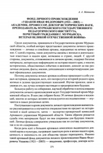А. А. Матвеева ФОНД ЛИЧНОГО ПРОИСХОЖДЕНИЯ «УШАКОВ ИВАН ФЕДОРОВИЧ (1921—2003) — АКАДЕМИК, ПРОФЕССОР, ДОКТОР ИСТОРИЧЕСКИХ НАУК, ПРЕПОДАВАТЕЛЬ МУРМАНСКОГО ГОСУДАРСТВЕННОГО ПЕДАГОГИЧЕСКОГО ИНСТИТУТА, ПОЧЕТНЫЙ ГРАЖДАНИН Г. МУРМАНСКА, ВЕТЕРАН ВЕЛИКОЙ ОТЕЧЕСТВЕННОЙ ВОЙНЫ» Среди документов, хранящихся в Государственном архиве Мурман ской области, особый интерес представляют документы личного проис хождения — личные и семейные архивы, переданные на вечное хране ние. С одной стороны, такие документы связаны с жизнью и деятельнос тью известных в нашем крае, возможно и стране, людей. С другой стороны, документы, отложившиеся в личном архиве, содержат богатые материалы, интересную информацию по истории нашего края, о многих исторических, общественных событиях и явлениях; доносят до нас раз личные сведения, факты, мнения, дополняющие и конкретизирующие дан ные официальных документов. Поэтому документы личных архивов особенно привлекают к себе уче- ных-историков, краеведов, всех, кто интересуется историей родного края, жизнью и делами предшествующих поколений. Изучая прошлое, ценя и уважая его, мы лучше познаем настоящее и предопределяем будущее. Большую работу по собиранию, научной обработке и использованию документов личного происхождения ведет Государственный архив Мур манской области. В нем уже собрано более 30 личных фондов и коллек ций, многие из которых активно используются исследователями — изу чаются в самых различных целях. Поступающие в архив документы личного происхождения вниматель но рассматриваются и изучаются специалистами на предмет их истори ческой и иной ценности, затем — экспертно-проверочной комиссией Архивного управления Мурманской области. Таким образом решается судьба этих материалов: будут ли они сохранены для будущих поколе ний. Личные фонды совершенно уникальны как по составу документов, так и по их содержанию. Когда речь идет о больших архивных комплексах выдающихся дея телей науки и культуры, сыгравших заметную роль в жизни нашего края, ценность и значимость их для общества трудно переоценить. Именно такой архивный фонд документов личного происхождения Ивана Федо ровича Ушакова (1921—2003) — академика, профессора, доктора исто 271