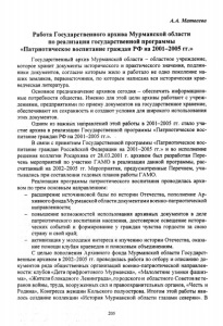 А.А. Матвеева Работа Государственного архива Мурманской области по реализации государственной программы «Патриотическое воспитание граждан РФ на 2001-2005 гг.» Государственный архив Мурманской области - областное учреждение, которое хранит документы исторического и практического значения, подлин ники документов, согласно которым жило и работало не одно поколение на ших земляков, первоисточники, по которым написана вся историческая крае ведческая литература. Основное предназначение архивов сегодня - обеспечить информацион ные потребности общества. Именно для этой цели архивы работают с учреж дениями, предприятиями по приему документов на государственное хранение, обеспечивают их сохранность и создают условия для широкого использования этих документов. Одним из важных направлений этой работы в 2001-2005 гг. стало уча стие архива в реализации Государственной программы «Патриотическое вос питание граждан РФ на 2001-2005 гг.». . В связи с принятием Государственной программы «Патриотическое вос питание граждан Российской Федерации на 2001-2005 гг.» и во исполнение решения коллегии Росархива от 28.03.2001 г. архивом был разработан Пере чень мероприятий по участию ГАМО в реализации данной программы, рас считанный на 2002-2005 гг. Мероприятия, предусмотренные Перечнем, учи тывались при составлении годовых планов работы ГАМО. Реализация программы патриотического воспитания проводилась архи вом по трем основным направлениям: - расширение источниковой базы по истории Отечества, пополнение Ар хивного фонда Мурманской области документами военно-патриотической направленности; - повышение возможностей использования архивных документов в деле патриотического воспитания населения, достоверное освещение истори ческих событий и формирование у граждан чувства гордости за свою страну и свой край; - активизация у молодежи интереса к изучению истории Отечества, оказа ние помощи клубам краеведов и поисковым объединениям. С целью пополнения Архивного фонда Мурманской области Государст венным архивом в 2002-2005 гг. проводилась работа по отбору и описанию до кументов ряда общественных организаций военно-патриотической направлен ности: клубов «Дети прифронтового Мурманска», «Малолетние узники фашиз ма», «Жители блокадного Ленинграда», го родского и областного Советов вете ранов войны, труда, вооруженных сил и правоохранительных органов, «Честь и Родина», Конгресса женщин Кольского полуострова. Итогом этой работы яви лось создание коллекции «История Мурманской области глазами северян». В 205