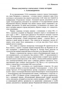 А.А. Матвеева Новые документы о начальных этапах истории г. Александровска В год празднования 110-й годовщины славного города Александров­ ска, ныне Полярного, в прошлом - столицы нашего северного края очень логичным и актуальным нам видится вынесение этой темы как главной на конференции «Ушаковские чтения». Основной массив документов по ис­ тории Александровска находится на хранении в Государственном архиве Мурманской области. Каждый этап жизни города нашел отражение в ар­ хивных документах. В своем выступлении я остановлюсь на самом глав­ ном в истории каждого города документе, образно говоря, его «свидетель­ стве о рождении». Первые страницы истории связаны с возникшим в конце 80-х гг. XIX в. проектом создания на Мурмане военного порта и посещением на­ шего края в 1894 г. министром финансов Российской империи Сергеем Витте. Екатерининская гавань в Кольском заливе произвела на него неиз­ гладимое впечатление. «Такой грандиозной гавани, - отмечал Витте, - я никогда в своей жизни не видел». Она «никогда не замерзает, весьма об­ ширна, легко может быть защищаема», и «оттуда наш флот будет иметь прямой доступ в океан». Но в связи со смертью императора Александра III строительство не было начато, а проект создания военно-морской базы на Мурмане не на­ шел поддержки у правительства Николая II. Нужны были средства на строительство военно-морской базы на Балтике и на Дальнем Востоке. Вопрос о строительстве города и порта в Екатерининской гавани, но уже коммерческого, а не военного, был решен в 1896 г. С предложением о постройке в гавани торгового порта и перенесения в новый город органов местной власти снова выступил С.Ю. Витте, считая необходимым прибли­ зить административный центр края к районам рыбного промысла. Госу­ дарственный совет одобрил предложение С.Ю. Витте, и на строительство порта и города было ассигновано 400 тысяч рублей. 24 июня 1899 г. состоялось его торжественное открытие. Он сразу стал уездным центром и получил название Александровск - в честь Алек­ сандра Третьего. В Государственном архиве сохранился уникальный до­ кумент «Дело о посещении Великим князем Владимиром Александровичем г. Александровска при Екатерининской гавани, освещении и открытии го­ рода» за 1899 г. В данном случае «уникальный» - не просто прилагатель­ ное, а архивный термин, обозначающий официальный (самый высокий) статус документа, который он получил совсем недавно, в 2007 г. в процес­ се планомерной работы архивистов по выявлению уникальных и особо ценных документов в Архивном фонде Мурманской области и включения