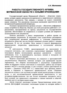 А.А. Матвеева РАБОТА ГОСУДАРСТВЕННОГО АРХИВА МУРМАНСКОЙ ОБЛАСТИ С ЮНЫМИ КРАЕВЕДАМИ Государственный архив Мурманской области - областное учреж дение, которое хранит документы исторического и практического значения, подлинники документов. Они связаны с жизнью не одного поколение наших земляков. Эти документы послужили написанию практически всей исторической краеведческой литературы. Основное предназначение архивов сегодня - обеспечить информаци онные потребности общества. Именно для этой цели архивы работают с уч реждениями, предприятиями по приему документов на государственное хранение, обеспечивают их сохранность и создают условия для широкого использования этих документов. Хочется рассказать о новых направлениях в работе архива по использованию документов. В последние годы существенно расширился круг потребителей архивной информации, и, учитывая современные потребности общества, мы все больше внимания уделяем работе с юными краеведами. И это не случайно. Ведь именно в юности формируются мировоззрение, патриотизм, нравственные и эстетические качества личности. В деятельности ГАМО, ориентированной на школьников и учащуюся молодежь, уже сложились определенные традиции. Наиболее популярные формы использования архивных документов - газетные публикации, теле- и радиопередачи, выставки, лекции и экскурсии по архиву, дни «открытых дверей». Ведется подготовка рассчитанных на учащихся и преподавателей документальных сборников, значение которых для краеведения трудно переоценить. Это сборник воспоминаний и документов «Гражданская война на Мурмане глазами участников и очевидцев», работа над которым архива и МГПУ в полном разгаре, и уже готовая к печати хрестоматия по истории г. Кировска (1920-1945 гг.), совместный труд филиала нашего архива в Кировске и Кировского краеведческого музея. Сборники документов нужны и для изучения истории нашей малой родины в школах, вузах, и для исследовательской краеведческой деятельности, и для историков-профессионалов, так как только подлинные документы могут быть основой для правильного понимания и оценки явлений и событий, имевших место в истории нашего края. Архив помогает школьным музеям. Предоставленные копии доку ментов, фотографий пополняют экспозиции музеев по истории войны в 58