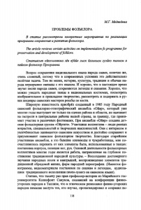 М.Г. Медведева ПРОБЛЕМЫ ФОЛЬКЛОРА В статье рассмотрены конкретные мероприятия по реализации программы сохранения иразвития фольклора. The article reviews certain activities on implementationfo programme for preservation and development o ffolklore. Статъясът кйххчьюввма лев вуййк лыгк йллькьем гуэйкэ пыннем я пайнэм фольклор Программа. Вопрос сохранения национального языка народа саами, конечно же, очень сложный, потому что в современных условиях это действительно нелёгкая задача. Тем не менее, история, культура, традиции и обычаи на рода неразрывно связаны с его языком. И хорошо, что в настоящее время звучат песни народа саами, сохраняются легенды и сказания. Хорошо, что можно увидеть народные танцы в национальных костюмах, посмотреть изобразительное и прикладное творчество, рассмотреть и подержать в ру ках шедевры саамских мастеров резьбы по кости. Широкую известность приобрёл созданный в 1985 году Народный саамский фольклорно-этнографический ансамбль «Ойяр», который уже многие годы выступает не только на сценах района и области, но выезжает на гастроли в центральные районы нашей страны, за границу, где прини мает участие в различных фестивалях. При ансамбле «Ойяр» создана дет ская фольклорная группа «Ойрэнч». Участники коллектива - люди разных возрастов, специальностей и творческих наклонностей. Они с интересом и увлечённостью занимаются саамским искусством и достойно сохраняют и приумножают саамское фольклорное творчество. Благодаря старейшим участникам ансамбля, а это бывшие оленеводы и чумработницы, мне по счастливилось перенять от них элементы быта, использованные в танцах: постановка корпуса, позиция ног, рук. Основой деятельности фольклорных коллективов многие годы является работа, направленная на глубокое по стижение традиционной народной культуры. - Воссоздание достоверного звучания народных песен и наигрышей, воспроизведение элементов тра диционной обрядовой жизни, форм народной хореографии. (Имеются фо нограммы, видеоматериалы постановок по сказкам и легендам, аудиоза писи традиционного исполнения песен-луввтэ на саамском языке). Считаю, что тысячу раз прав профессор-историк из Марийского гос- университета Ксенофонт Сануков, сказавший на конференции финно- угорских народов в Таллине, что в этническом ренессансе финно-угорских народов немалая заслуга тех, кто изучал, пропагандировал и сохранял ис 118