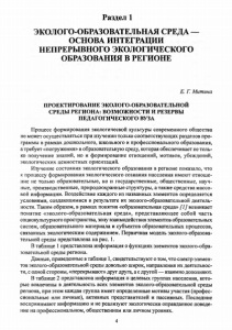 Раздел 1 ЭКОЛОГО-ОБРАЗОВАТЕЛЬНАЯ СРЕДА — ОСНОВА ИНТЕГРАЦИИ НЕПРЕРЫВНОГО ЭКОЛОГИЧЕСКОГО ОБРАЗОВАНИЯ В РЕГИОНЕ Е. Г. Митина ПРОЕКТИРОВАНИЕ ЭКОЛОГО-ОБРАЗОВАТЕЛЬНОЙ СРЕДЫ РЕГИОНА: ВОЗМОЖНОСТИ И РЕЗЕРВЫ ПЕДАГОГИЧЕСКОГО ВУЗА Процесс формирования экологической культуры современного общества не может осуществляться при изучении только соответствующих разделов про граммы в рамках дошкольного, школьного и профессионального образования, а требует «погружения» в образовательную среду, которая обеспечивает не толь ко получение знаний, но и формирование отношений, мотивов, убеждений, экологических ценностных ориентаций. Изучение состояния экологического образования в регионе показало, что к процессу формирования экологического сознания населения имеют отноше ние не только образовательные, но и государственные, общественные, науч ные, производственные, природоохранные структуры, а также средства массо вой информации. Воздействие каждого из названных элементов определяется условиями, создающимися в результате их эколого-образовательной деятель ности. Таким образом, в рамках понятия «образовательная среда» [1] возникает понятие «эколого-образовательная среда», представляющее собой часть социокультурного пространства, зону взаимодействия элементов образовательных систем, образовательного материала и субъектов образовательных процессов, связанных экологическим содержанием. Первичная модель эколого-образова тельной среды представлена на рис. 1. В таблице 1 представлена информация о функциях элементов эколого-обра зовательной среды региона. Данные, приведенные в таблице 1, свидетельствуют о том, что спектр элемен тов эколого-образовательной среды довольно широк, направления их деятельнос ти, с одной стороны, «перекрывают» друг друга, а с другой — взаимно дополняют. В таблице 2 представлена информация о целевых группах населения, кото рые вовлечены в деятельность всех элементов эколого-образовательной среды региона, при этом каждая группа имеет определенные мотивы участия (профес сиональные или личные), активных представителей и пассивных. Последние воспринимают информацию и не реализуют экологически оправданное поведе ние на профессиональном, общественном или личном уровнях. 4