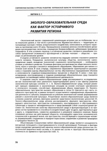 СОВРЕМЕННЫЕ ВЫЗОВЫ И УГРОЗЫ РАЗВИТИЮ МУРМАНСКОЙ ОБЛАСТИ: РЕГИОНАЛЬНЫЙ АТЛАС МИТИНА Е. Г. ЭКОЛОГО-ОБРАЗОВАТЕЛЬНАЯ СРЕДА КАК ФАКТОР УСТОЙЧИВОГО РАЗВИТИЯ РЕГИОНА «Экологический вызов» современной цивилизации актуален как на глобальном, так и на локальном уровне, в том числе и региональном. Мурманская область — территория, ис­ пытывающая высокую степень антропогенного воздействия, интенсивность которого нарас­ тала на протяжении всего XX века. Промышленное освоение региона способствовало дегра­ дации высокоширотных экосистем, сокращению биоразнообразия, урбанизации природных ландшафтов. В этих условиях переход к устойчивому развитию становится важнейшим спо­ собом преодоления сложившихся противоречий в системе «человек — общество — при­ рода» на региональном уровне. В модели устойчивого развития человечества ведущим законом становится развитие качеств человека. Повышение экологической культуры общества, экологическое самоо­ пределение людей, овладение технологией социального проектирования — необходимое условие устойчивого развития. Основным фактором воспроизводства общественного интел­ лекта, науки и культуры становится непрерывное образование, образование для жизни и в течение всей жизни. В свою очередь, современное образование характеризуется расшире­ нием и стиранием границ образовательных систем, обусловленных наращиванием объемов и интенсивности социально-коммуникативных процессов в обществе. В связи с этим про­ ектирование, конструирование и создание развивающих образовательных сред становится важнейшей составляющей любой образовательной деятельности. В широком смысле эколого-образовательная среда рассматривается исследователя­ ми как «экологический класс различного территориального ранга» и как «фактор развития экологической культуры учителя» [1, с. 3]. Эколого-образовательная среда, которая реали­ зует принцип «вживания» в экологическую ситуацию на основе сочетания чувственного и логического познания, способствует «формированию образа территории» [1]. Эколого­ образовательное пространство высшего образования в статье [5] трактуется как «часть со­ циального пространства, в рамках которого осуществляется нормированная образователь­ ная деятельность субъекта, направленная на усвоение экологической знаний, формирование умений и экологической культуры». Аттрактивная эколого-образовательная среда является условием развития региона, фактором развития нравственно-экологических ценностей [7]. Эколого-образовательная среда региона рассматривается «фрагмент пространства, обла­ дающего целостностью, пространства познаваемого, конструируемого и обустраиваемого субъектами в процессе жизнедеятельности и представляющей собой социокультурный фе­ номен» [6]. Экологические свойства образовательной среды и функционирующих в ее пре­ делах систем проявляются в способности воздействовать друг на друга, адаптироваться друг к другу, а, следовательно, совместно развиваться в результате взаимного влияния. Важно понимание региона как действующей общности, отличающейся единством экономической, политической и духовной жизни, как пространства, способствующего социализации челове­ ка, формированию, сохранению и передаче норм жизни, сохранению и развитию природных и культурных богатств 