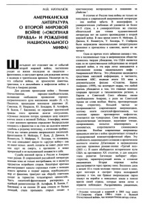 М.В. НАУМЛЮК АМЕРИКАНСКАЯ ЛИТЕРАТУРА О ВТОРОЙ МИРОВОЙ ВОЙНЕ («ОКОПНАЯ ПРАВДА» И РОЖДЕНИЕ НАЦИОНАЛЬНОГО МИФА) I I I ■ ■ ■ естьдесят лет отделяют нас от событий H J U I второй мировой войны, постепенно уходят из жизни последние ее свидетели - фронтовики, и наступает время для рождения легенд о великом и трагическом времени. Несмотря на то, что события войны, их хронология известны, трактовка, а в дальнейшем и мифология войны в России и Америке разная. Для россиян прошедшая война - Великая Отечественная, народно-освободительная, вызвавшая «небывалое проявление героико патриотического духа миллионов людей» (9, с.З). Писатели, прошедшие военными дорогами (К. Симонов, Н. Некрасов, Ю. Бондарев, В. Астафьев, В. Быков, Г. Бакланов), не скрывают трагической правды этого времени: долгое отступление, огромные людские потери, кровавую цену каждого клочка земли и великой Победы. Атмосферу жизни и книг военного времени определяет беспредельная ненависть к фашистам и на этом же высоком накале «любовь к родному пепелищу, к отеческим гробам». Когда мы читаем романы американских писателей- фронтовиков Н. Мейлера, Г. Вука, Д. Джонса, К. Воннегута, Э. Майрера, У. Хеллера, то понимаем, что они описывают какую-то «другую войну»: она не имеет ясных целей, солдаты не знают, ради чего они идут на смерть, а противник и вовсе призрачный и не вызывающий ненависти к себе. Судьба военной прозы в России и Америке тоже разная. В современной российской литературе военная тема не только востребована, но и является предметом острейших споров. Некоторые критики рассматривают идеалы сороковых годов с позиции нового времени и подвиг народа, освободившего мир от фашизма, трактуют как «борьбу советских солдат за торжество тоталитарных ценностей». Часть писателей-фронтовиков растерялась в идейной разноголосице (В. Астафьев, В. Быков, Г. Бакланов) и на склоне 20 века отошла от былых позиций, стала призывать старых солдат к христианскому всепрощению и покаянию за убийство В отличие от России тема войны не только не популярна в современной американской литературе она вообще забыта. В монографиях и университетских учебниках ей уделяется не более 10-15 строк, а в университетских же списках обязательной для чтения художественной литературы нет ни одного произведения о второй мировой войне. В свое время книги Н. Мейлера, Д. Джонса, К. Воннегута, У. Хеллера, У. Стайрона были награждены национальными литературными премиями и причислены к классике, нынче их не читают. Одна из причин этого забвения связана с тем, что в послевоенные годы в американском обществе сложилось твердое убеждение, что США являются едва ли не единственными победителями во второй мировой войне, и эта вера легко вписывается в мессианские основы национального мифа Американской Мечты. Это убеждение насаждается средствами массовой информации, в частности, компания ABC, подводя итоги XX века в документальном фильме «Столетие. Время Америки» (1999), так монтирует кадры, что любой зритель убеждается в том, что главные военные операции проходят в тихоокеанском регионе, а Европа и Советский Союз обязаны своим освобождением Америке, о роли же Советской Армии ни слова вообще. Факты, противоречащие этому стереотипу, большей частью не воспринимаются современными американцами, поэтому книги писателей-фронтовиков, чья «окопная правда» п