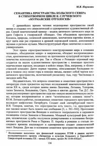 М.В. Наумлюк СЕМАНТИКА ПРОСТРАНСТВА КОЛЬСКОГО СЕВЕРА В СТИХОТВОРНОМ ЦИКЛЕ К. СЛУЧЕВСКОГО «МУРМАНСКИЕ ОТГОЛОСКИ »1 С древнейших времен человек моделировал пространство своей жизни и создавал его символический и одновременно художественный об раз. Самый замечательный пример - модель античного греческого мира на щите Гефеста в гомеровской «Илиаде». Она объединила пространства Космоса, природы, эллинской цивилизации, запечатлела картины жизни, и круг щита еще раз отразился в древней хороводной пляске, дополненной звуками и ритмом музыки. Многоструктурный образ запечатлел в малом - универсальное. Этот прием «пространственного конструирования мира в сознании человека», объединения микро- и макрокосма, обладает воспроизводимо стью, архетипичностью, поскольку на протяжении культурной истории че ловечества используется не раз. Так в «Песне о Роланде» огромный мир создается на малом художественном пространстве с помощью простого перечисления народов, входящих в войско эмира. Или, например, в «Боже ственной комедии» Данте первые терцины, описывающие блуждания ге роя в темном лесу возле горы в поисках звезды, являют собой чертеж кос мического пространства, включающий расщелину Ада, гору Чистилища и звездное небо Рая. Неудивительно, что вопросы семантики и семиотики пространства в литературе стали предметом научных исследований замечательных фило логов XX в., среди которых важны имена Лихачева, Лотмана, Топорова, также Зиммеля, Беньямина, Серто, Турома и многих других. Так Д.С. Ли хачев рассматривает пространство сада как «некую иконологическую систе му, которая воспринимается в свете “эстетического климата эпохи”». Ю.М. Лотман в работах, посвященных семиотике городского пространства, исследует мифологию Петербурга. Создает свой «петербургский текст» В.Н. Топоров, замечая, что «пространство есть текст», т.е. пространство как таковое может быть понято как сообщение [3, с. 501-502]. Прочтению городского пространства Венеции в контексте театральности и карнавала посвящены статьи Зиммеля и Беньямина. Мощный культурный фон, исто рия, человеческие судьбы послужили развертыванию и осознанию безгра ничных пространств Рима и Парижа. П. Акройд в романах и статьях по следнего времени анализирует и одновременно создает семиотический текст Лондона. Для нас в осознании семантики пространства важно выска 1 Исследование выполнено при финансовой поддержке РГНФ в рамках научно- исследовательского проекта «Литература и культура Кольского и Европейского Севера второй половины XX - начала XXI века», проект № 10-04-4302а/С. 136