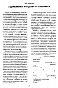 М.В. Наумлюк ХУДОЖЕСТВЕННЫЙ МИР ДРАМАТУРГИИ КАММИНГСА Эдвард Эстлин Каммингс (1894-1962) - выдающийся американский поэт, худож ник, драматург, реформатор поэтической речи, родился в семье университетского профессора, священника, закончил отде ление классической филологии в Гарвар де и в 1916 году получил степень магист ра. Жажда деятельности и новых жизнен- ных впечатлений привела его во Францию, к местам боевых действий пер вой мировой войны. После войны, кото рая закончилась для поэта коротким зак лючением в тюрьме, он остался в Пари же, где занялся изучением живописи современных художников, познакомился с писателями из круга Гертруды Стайн и сам заинтересовался художественным экспериментом. По возвращении в Аме рику Каммингс получил признание как поэт-новатор, неординарный художник и интеллектуал, будоражащий американ цев своими книгами, выставками и вы зывающими экспериментами. Художественный метод Каммингса, как у многих американских писателей XX века, объединяет разные компонен ты: философское осмысление человека Сократом иПлатоном, просветительские идеи «естественного» человека и их пре ломление в американской действительно сти, естественно - научные теории Фрей да иЮнга, экспрессионистские символы. Однако, целостность мировоззрению и художественному творчеству Каммингса придает ведущая тема его произведений - тема непреложной ценности свободной творческой личности. Личность и цивили зация, личность и свобода, личность, ил люзии и правда, личность и творчество - вот те проблемы, которые Каммингс счи тает ключевыми и вечными во всемир ной истории, начиная с античности и за канчивая XX веком. Стремление создать неповторимый художественный мир, запечатлеть его с помощью индивидуального поэтическо го языка приводит Каммингса к экспери менту. С помощью ритма, прерыва логи ческой связи он придает слову и образу динамику; соединяет графический и сло весный образ, синтезирует изобразитель ное и словесное искусство. В критике этот эксперимент получил название «typographical style». Каммингс соединяет жаргон с высо ким поэтическим словом, вульгаризмы с научной лексикой; он перемешивает все стили речи, стремясь передать ритм со временности, дыхание живого мира. Кам мингс1«отмывает» речь от штампов, воз вращая слову первозданность. Он сопря гает поэзию и живопись и, по мнению современных критиков, пишет стихи «не только для ушей, но и для глаз». В каче стве самого знаменитого примера его по этических экспериментов приведем его знаменитое стихотворение «Кузнечик» (Grasshopper) в котором он с помощью необычной графики рисует образ кузне чика, готовящегося к прыжку: r-p-o-p-n-e-s-s-a-g-r who a)sw(eloo)k upnowgatn PREG ORH RASS Evmgint(o- a)The):I eA !p: D S (r riving -gRrEaPsPhOs) to rea(be)rran(com)gi(e)ngly .grasshopper; (1,396) 38