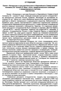 ОТ РЕДАКЦИИ Проект «Литература и культура Кольского и Европейского Севера второй половины 20 -начала 21 века»: итоги межрегионального семинара с международным участием, перспективы Проект «Литература и культура Кольского и Европейского Севера второй половины 20 - начала 21 века» посвящён вопросам культурного сотрудничест ва приграничных регионов России, Норвегии, Финляндии на протяжении по следних 25 лет. Целью его стало обобщение результатов творческого взаимо действия в области театрального и музыкального искусства, библиотечного и музейного дела, анализ перспективности совместных издательских проектов, интерактивной образовательной деятельности, а также изучение сложившегося диалога северных писателей и публицистов. Заметим, что отдельные направ ления культурного сотрудничества были освещены в журнале «Вестник Баренц - центра МГПУ», научных сборниках, изданных под эгидой МГПУ, например, в сборнике «Сотрудничество России и стран Северной Европы в гуманитарной сфере» за 2007 год, ряде других изданий. Однако мы стремимся рассмотреть не только отдельные аспекты культурного взаимодействия, но его генеральные тенденции, смысл долговременных творческих проектов, перспективы и харак терные черты приграничных культурных связей, как они сложились, прежде всего, на территории Кольского Севера. Принципиальным подходом последних лет стало планирование долго срочных проектов практически во всех областях культуры и искусства. Так, рос- сийско-норвежское библиотечное сотрудничество в Мурманской области суще ствует более 10 лет и включает обмен опытом, создание информационных цен тров, пополнение книжных фондов произведениями, в первую очередь, нор вежских писателей, совместное участие в форумах и конференциях, посвящён ных различным аспектам литературы, создание двуязычных рукописных книг. Мурманский областной краеведческий музей с конца 1990-х годов начал работать по проекту «Евро - Арктический ковчег», позднее появились и реали зовались интересные идеи совместных выставок и музейных мероприятий. Мурманский областной художественный музей за 7 последних лет осуществил не менее 17 проектов с музеями приграничных стран. В течение десяти лет Мурманская областная филармония работает в тесном контакте с музыкантами стран Скандинавии и Финляндии, венцом со трудничества стало исполнение опер Пуччини, Чайковского, Верди. Театр Северного флота ставит пьесы финских и норвежских авторов с 1990-х годов прошлого века, привлекая к сотрудничеству норвежскую сторону. А Мурманский областной театр кукол в течение 30-ти лет создаёт спектакли по произведениям знаменитых норвежских и финских писателей, в последние го ды артисты выезжают на гастроли в страны Скандинавии и Финляндии и игра ют спектакли на языке оригинала. Стремление расширить сотрудничество, придать ему многомерность, объединить разнообразные творческие силы привело к рождению в1999 году таких интересных проектов, как ежегодные Дни культуры Норвегии, Дни культу ры Финляндии. Причём проходят они с участием сотрудников библиотек и му зеев, артистов филармонии, писателей, художников, преподавателей и студен тов Мурманского государственного педагогического (а с 2010 года гуманитарно 3