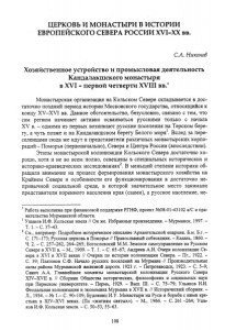 ЦЕРКОВЬ И МОНАСТЫРИ В ИСТОРИИ ЕВРОПЕЙСКОГО СЕВЕРА РОССИИ ХѴІ-ХХ вв. С.А. Никонов Хозяйственное устройство и промысловая деятельность Кандалакшского монастыря в XVI - первой четверти XVIII вв.* Монастырская организация на Кольском Севере складывается в дос таточно поздний период истории Московского государства, относящийся к концу ХѴ-ХѴІ вв, Данное обстоятельство, безусловно, связано с тем, что сам регион начинает активно осваиваться русскими только с начала XV в. - одними из первых возникают русские поселения на Терском бере гу, а чуть позже и на Кандалакшском берегу Белого моря1. Вслед за пере селенцами сюда же идут и представители различных монастырских корпо раций- Поморья (первоначально), Севера и Центра России (впоследствии). Этапы монастырской колонизации Кольского Севера достаточно хо рошо, хотя и не во всем полно, освещены в специальных исторических и историко-краеведческих исследованиях2. В меньшей степени историки об ращали внимание на процесс формирования монастырского хозяйства на Крайнем Севере и особенности его функционирования в достаточно не привычной социальной среде, в которой значительное место занимали представители коренного населения края (саами), а русское население, не* Работа выполнена при финансовой поддержке РГНФ, проект №08-01-43102 а/С и пра вительства Мурманской области. 1 Ушаков И.Ф. Кольская земля // Он же. Избранные произведения. - Мурманск, 1997. - Т. 1. - С. 37—43. 2 См., например: Подробное историческое описание Архангельской епархии. Б.м. Б.г. - С. 171-173; Русская церковь в Поморье // Православный собеседник, - Казань, 1860. - Ч. 2. - С. 257-262, 264-265; Богословский М.М. Земское самоуправление на Русском Севере в XVII в. - М., 1909. - Т. 1. - С. 65-67; Андреев А.И. Очерк колонизации Се вера в XVI и XVII веках // Очерки по истории колонизации Севера. - Пг., 1922. - С. 39; Платонов С.Ф. Начало русских поселений на Мурмане // Производительные силы района Мурманской железной дороги. 1923 г. - Петрозаводск, 1923. - С. 5-9; Савич А.А. Главнейшие моменты монастырской колонизации Русского Севера ХІѴ-ХѴІІ в. // Сборник Общества исторических, философских и социальных наук при Пермском университете. - Пермь, 1929. - Вып. III. - С. 75-79; Ульянов Н.И. Феодальная колонизация и экономика Мурмана в XVII в. // Исторический сборник. - Л., 1934. - № 1,- С. 90-109; Будовниц И.У. Монастыри на Руси и борьба с ними кре стьян в ХІѴ-ХѴІ веках. (По «житиям святых»), - М., 1966. - С. 261 -264; Уша ков И.Ф, Кольская земля. - С. 50-53, 55-63. 108