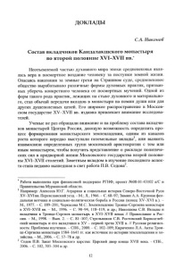 ДОКЛАДЫ С.А. Никонов Состав вкладчиков Кандалакшского монастыря во второй половине ХѴІ-ХѴІІ вв.’ Неотъемлемой частью духовного мира эпохи средневековья явля лась вера в посмертное воздание человеку за поступки земной жизни. Опасаясь наказания за земные грехи на Страшном суде, средневековое общество вырабатывало различные формы духовных практик, призван ных уберечь конкретного человека от посмертных мучений. Одной из форм такого рода практик, лежащих на стыке духовного и материально го, стал обычай передачи вкладов в монастыри на помин души или для других душеполезных целей. Его широкое распространение в Москов ском государстве ХѴ-ХѴІІ вв. издавна привлекает внимание исследова телей. Ученые не раз обращали внимание и на проблему состава вкладчи ков монастырей Центра России, дающую возможность определить про цесс формирования монастырского землевладения, одним из каналов роста которого нередко выступали поземельные вклады1, или выявить взаимосвязи определенных групп московской аристократии с тем или иным монастырем, чтобы получить представление о раскладе политиче ских сил в придворной жизни Московского государства второй полови ны ХѴІ-ХѴІІ столетий. Заметным вкладом в изучение последнего аспек та стала недавно вышедшая в свет работа П.В. Седова2. Работа выполнена при финансовой поддержке РГНФ, проект №08-01-43102 а/С и Правительства Мурманской области. 1 Например: Алексеев Ю.Г. Аграрная и социальная история Северо-Восточной Руси ХѴ-ХѴІ вв. Переяславский уезд. -М .; Л., 1966. - С. 68-97; Зимин А.А. Крупная фео дальная вотчина и социально-политическая борьба в России (конец XV-XV1 в.). — М., 1977. - С. 189-201; Черкасова М.С. Землевладение Троице-Сергиева монастыря в ХѴІ-ХѴІІ вв. - М., 1996. - С. 90-94, 118-119, и др.; Николаева С.В. Вклады и вкладчики в Троице-Сергиев монастырь в XV1-XV1I веках // Православие в Рос сии. - М., 1998. - Вып. 2. - С. 81-107; Стрельников С.В. Ростовский Борисоглеб ский монастырь и его вкладчики в XV - первой трети XVII в. // Русская религиоз ность: Проблемы изучения. - СПб., 2000. - С. 102-109; Кириченко Л.А. Акты Трои- це-Сергиева монастыря 1584-1641 гг. как источник по истории землевладения и хо зяйства. - М., 2006. - С. 57-78 и др. 2 Седов П.В. Закат Московского царства: Царский двор конца XVII века. - СПб., 2006. - С. 102, 303-304 и др. 12