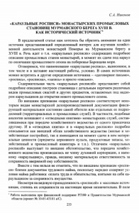 С.А. Никонов «КАРАУЛЬНЫЕ РОСПИСИ» МОНАСТЫРСКИХ ПРОМЫСЛОВЫХ СТАНОВИЩ МУРМАНСКОГО БЕРЕГА XVIII В. КАК ИСТОРИЧЕСКИЙ ИСТОЧНИК *1 В предлагаемой статье нам хотелось бы обратить внимание на один источник представляющий определенный интерес для изучения хозяйст венной деятельности монастырей Поморья на Мурманском берегу в XVIII в. Речь идет о т.н. «караульных росписях» содержащих подробное описание промысловых станов монастырей, в момент их сдачи под караул по окончании промыслового сезона на побережье Баренцева моря. Оговоримся, что наименование «караульная роспись», вынесенное, в том числе и в заглавие настоящей работы, условно. В самих источниках можно встретить и другие определения источника - «договорное письмо», «роспись», «росписка», «запись» и просто «письмо». Содержательная часть «караульных росписей» представляет собой подробное описание построек становища с детальным перечнем различных видов промысловых снастей и других предметов, оставляемых под надзо ром караульщиков до открытия нового промыслового сезона. По внешним признакам «караульные росписи» соответствуют неко торым видам монастырской делопроизводственной документации фикси рующей материальное состояние самой обители или отдельных ее подраз делений (территориальных и промысловых служб). В частности, подобные аналогии возникают с «отводными книгами» монастырских служб, состав лявшимися при передаче хозяйственного ведомства от одного приказчика другому. И в «отводных книгах» и в «караульных росписях» подробно описывается как внешний облик хозяйственного ведомства (жилые и хо зяйственные постройки), так и имеющиеся на момент сдачи в нем матери альные ценности (предметы церковного культа, продуктовые запасы, хо зяйственный и промысловый инвентарь и т.п.). Отличием «караульных росписей» выступает то внешнее обстоятельство, что передача хозяйст венного ведомства производилась не члену духовной корпорации, а наем ному «караульщику», правда, несшему материальную ответственность за сохранность вверяемой ему собственности. Вместе с тем нельзя не отметить, что по внешним признакам «роспи си» близки документам трудового найма, поскольку нередко содержат ус ловия найма работника: оплата труда и обязательства, взятыми на себя ка раульщиком за сохранность имущества. Несмотря на видовую принадлежность «росписей» к массовым источ никам, степень их сохранности на настоящее время незначительна. В поле ' Работа выполнена при финансовой поддержке РГНФ и Правительства Мурманской области (проект № 10-01-43101 а/С). 233