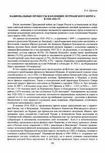 Е.А. Орехова НАЦИОНАЛЬНЫЕ ПРОЦЕССЫ В КОЛОНИЯХ МУРМАНСКОГО БЕРЕГА В 1920-1922 ГГ. После окончания Гражданской войны на Севере России и установления на Мур мане советской власти в национальном составе мурманских колоний проявились новые тенденции - изменение в соотношении численности национальных групп колонистов и активная ассимиляция меньшинств, получившие развитие в ходе колонизации Мурман ского берега 1920-1930-х гг. По данным исследования 1920-1922 гг., в сравнении с 1899 г., сохранилось тради ционное разделение Мурмана на Западный, с преобладающим нерусским населением, и Восточный, главным образом русский. На Западном Мурмане большинство составляли финны, русские были самой малочисленной группой, наравне с кольскими саамами и саамами-фильманами (их в исследовании 1921-22 гг. не разделяли), и составляли 6,1% населения, уступая карелам (8,5%). По берегам Кольского залива также преобладали финны (72,1%), русские были второй по численности группой (17,7%), самой малочис ленной группой здесь были карелы (2,7%). На Восточном Мурмане подавляющее число населения составляли русские (90,9%), 4,7% - карелы. Норвежцы сохранили район сво его компактного проживания на п-ове Рыбачий и о.Кильдин. В 1922 г. на Мурманском берегу проживало 144 норвежца1. В этот период продолжался рост числа русских на Востоке, при увеличении отно сительного преобладания финнов на Западном Мурмане. В значительной степени этому способствовало то, что в 1920 г.°к Финляндии отошел район Печенгской губы, где были сконцентрированы русско-карельские колонии. Применительно к Мурману в целом, число финнов сократилось. Также и относительно всей территории Кольского Севера реальный прирост финского населения на Мурмане к середине 1920-х гг. был незначи телен. В 1897 г. в Кольском уезде жило 1071 финнов, в 1920 г. - 1427, в 1926 г. - 1627. Из них 1 134 человека жили на Мурманском берегу и большинство в Александровском районе (1079 человек), где они составляли 53,2% населения2. Одновременно исследова ние 1920-1922 гг. показало снижение численности национальных меньшинств (карел и саамов) за счет их ассимиляции двумя крупнейшими группами - русскими и финнами. Исключение в этом процессе составляли лишь норвежцы, образовавшие устойчивую, компактно проживавшую группу3. В течение 1914-1920 гг. продолжался приток новых переселенцев как с террито рии России, так и Финляндии. Уроженцы Великого Княжества Финляндского продол жали приходить на Мурман для промыслов или постоянного поселения. Финны, при нимавшие здесь подданство Советской России, в большинстве были выходцами из Улеаборгской губернии, проживавшими на Мурмане еще «по паспортам архангельского губернатора» и желавшими легализовать свое положение4. Хотя и в незначительных масштабах, продолжался въезд финнов через Норвегию, в том числе «красных», бежав ших в Россию после поражения в 1918 г. революции в Финляндии5. Помимо традици онных источников финской иммиграции, появляются и новые: рабочие, участвовавшие в строительстве Мурманской железной дороги; лесорубы из США и Канады, осевшие в основном в районе Кандалакши6. Мурманские финны в 1920-1930-х гг. сохраняли тра диционную систему хозяйства, язык и культуру, но в новых условиях самоизоляция финских колоний была невозможна. В них быстро проникали черты «нового быта» и 182