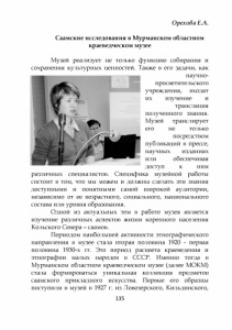 Орехова ЕЛ. Саамские исследования в Мурманском областном краеведческом музее Музей реализует не только функцию собирания и сохранения культурных ценностей. Также в его задачи, как научно просветительского учреждения, входят их изучение и трансляция полученного знания. Музей транслирует его не только посредством публикаций в прессе, научных изданиях или обеспечивая доступ к ним различных специалистов. Специфика музейной работы состоит в том, что мы можем и должны сделать эти знания доступными и понятными самой широкой аудитории, независимо от ее возрастного, социального, национального состава или уровня образования. Одной из актуальных тем в работе музея является изучение различных аспектов жизни коренного населения Кольского Севера - саамов. Периодом наибольшей активности этнографического направления в музее стала вторая половина 1920 - первая половина 1930-х гг. Это период расцвета краеведения и этнографии малых народов в СССР. Именно тогда в Мурманском областном краеведческом музее (далее МОКМ) стала формироваться уникальная коллекция предметов саамского прикладного искусства. Первые его образцы поступили в музей в 1927 г. из Ловозерского, Кильдинского, 135