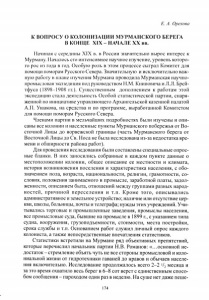 Е. А. Орехова К ВОПРОСУ О КОЛОНИЗАЦИИ МУ РМАНСКО ГО БЕРЕГА В КОНЦЕ X I X - Н А Ч А Л Е XX вв. Начиная с середины XIX в. в России значительно вырос интерес к Мурману. 11ачалось его интенсивное научное изучение, уровень которо го рос из года в год. Особую роль в этом процессе сыграл Комитет для помощи поморам Русского Севера. Значительную и исключительно важ ную работу в плане изучения Мурмана проводила Мурманская научно промысловая экспедиция под руководством I I.M. Книповича и Л.Л. Брей- тфуса (1898— 1908 гг.). Существенным дополнением к работам этой экспедиции стала деятельность Особой статистической партии, снаря женной но инициативе управляющего Архангельской казенной палатой А.II. Ушакова, на средства и по программе, выработанной Комитетом для помощи поморам Русского Севера. Членами партии в мельчайших подробностях были изучены и опи саны все колонии и населенные пункты Мурманского побережья от Во сточной Лицы до норвежской границы (часть Мурманского берега от Восточной Лицы до Св. Носа не была исследована из-за недостатка вре мени и обширности района работ). Для проведения исследования были составлены специальные опрос ные бланки. В них заносились собранные в каждом пункте данные о местоположении колонии, общее описание ее местности и климата, история возникновения поселения и характеристика населения, с обо значением пола, возраста, национальности, религии, грамотности, со словия, положения занимаемого в промысле, заработной платы, задол женности, описанием быта, отношений между группами разных народ ностей, причиной переселения и т.п. Кроме того, описывались административное и земельное устройство; наличие или отсутствие цер кви, школы, больницы, почты и телеграфа; нужды этих учреждений. Учи тывались торговые и промышленные заведения, промыслы населения, все промысловые суда, бывшие на промысле в 1899 г., с указанием типа судна, вооружения, грузоподъемности, стоимости, места постройки, срока службы и т.п. Основанием работ служил личный опрос каждого колониста, а также непосредственные впечатления статистиков. Статистики встретили на Мурмане ряд объективных препятствий, которые перечислил начальник партии Н.В. Романов: «...основной не достаток - стремление объять чуть не все стороны промысловой и коло ниальной жизни от гидротехники гаваней до нравов и обычаев населе ния включительно. Исследование продолжалось всего 2-2 Ч2 месяца и за это время охватило весь берег в 6-8 сот верст с единственным спосо бом сообщения - пароходом один раз в неделю. На суше нет даже пеше- 174