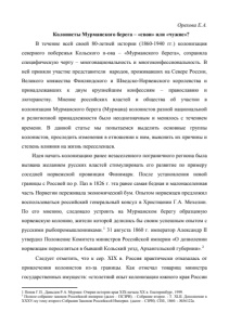 Орехова Е.А. Колонисты Мурманского берега – «свои» или «чужие»? В течение всей своей 80-летней истории (1860-1940 гг.) колонизация северного побережья Кольского п-ова – «Мурманского берега», сохраняла специфическую черту – многонациональность и многоконфессиональность. В ней приняли участие представители народов, проживавших на Севере России, Великого княжества Финляндского и Шведско-Норвежского королевства и принадлежавших к двум крупнейшим конфессиям – православию и лютеранству. Мнение российских властей и общества об участии в колонизации Мурманского берега (Мурмана) колонистов разной национальной и религиозной принадлежности было неоднозначным и менялось с течением времени. В данной статье мы попытаемся выделить основные группы колонистов, проследить изменения в отношении к ним, выяснить их причины и степень влияния на жизнь переселенцев. Идея начать колонизацию ранее незаселенного пограничного региона была вызвана желанием русских властей стимулировать его развитие по примеру соседней норвежской провинции Финнмарк. После установления новой границы с Россией по р. Паз в 1826 г. эта ранее самая бедная и малонаселенная часть Норвегии переживала экономический бум. Опытом норвежцев предложил воспользоваться российский генеральный консул в Христиании Г.А. Мехелин. По его мнению, следовало устроить на Мурманском берегу образцовую норвежскую колонию, жители которой делились бы своим успешным опытом с русскими рыбопромышленниками. 1 31 августа 1860 г. император Александр II утвердил Положение Комитета министров Российской империи «О дозволении норвежцам переселяться в бывший Кольский уезд, Архангельской губернии». 2 Следует отметить, что к сер. XIX в. Россия практически отказалась от привлечения колонистов из-за границы. Как отмечал товарищ министра государственных имуществ: «столетний опыт колонизации южного края России 1 Попов Г.П., Давыдов Р.А. Мурман: Очерки истории края XIX-начала XX в. Екатеринбург, 1999. 2 Полное собрание законов Российской империи (далее – ПСЗРИ). - Собрание второе. - Т. XLII. Дополнение к XXXV-му тому второго Собрания Законов Российской Империи. (далее – СЗРИ). СПб., 1860. - №36122а.