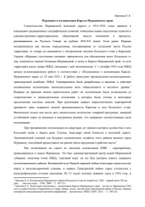 Орехова Е.А. Мурманск и колонизация Карело-Мурманского края. Строительство Мурманской железной дороги в 1915-1916 годах привело к изменению традиционных географических понятий, появлению новых населенных пунктов и административно-территориальных образований, внесло изменения в процессы, развивавшиеся на Русском Севере на рубеже XIX-ХХ веков. Если ранее Мурман воспринимался как вполне определенная, изолированная от остальной части России территория, то теперь он связывается с внутренними частями Кольского п-ова и Карелией. Термин «Мурман» постепенно начинает применяться для обозначения всего Кольского п- ова, появляется термин Олонецко-Мурманский, а затем и Карело-Мурманский край, то есть территория вдоль линии МЖД, связанная с ней экономически. С 1 октября 1923 года МЖД начала колонизационную работу в соответствии с «Положением о колонизации Карело- Мурманского края» от 25 мая 1923 г. К работе приступил промышленно-колонизационно- транспортный комбинат МЖД. Одновременно были разработаны и введены в действие посвященные колонизации законодательные акты общесоюзного и местного уровня . 1 Впервые ко времени начала практических работ по колонизации были установлены ее теоретические и законодательные положения, в которых были учтены и некоторые предложения местных властей. При реализации первых переселенческих мероприятий приоритет явно отдавался лесной промышленности Карелии и юга Кольского п-ова. Фактически только она могла дать значительное количество товарной продукции, имевшей устойчивый спрос на внешнем и внутреннем рынках, что напрямую соответствовало цели колонизации. При продвижении колонизации на север края, её главным центром должен был стать Кольский залив и берега реки Туломы, благодаря своей близости к железной дороге. Экономической основой для будущих колонистских хозяйств этого района являлся город Мурманск, способный предоставить им рынки сбыта продукции и рабочие места . 2 Мы остановимся на одном из эпизодов колонизации КМК – мероприятиях, проводившихся в самом Мурманске. Это был административный центр новой Мурманской губернии, конечная точка МЖД, торговый порт, он же был центром самого северного колонизационного района. Возникший ходе Первой мировой войны благодаря строительству порта и железнодорожной станции, в период Гражданской войны город столкнулся с катастрофическим оттоком населения. Из 15 тысяч человек, живших здесь в 1916 году, в 1 Орехова Е.А. Колонизация Мурманского берега Кольского п-ова во второй пол. XIX – первой трети ХХ вв.: дисс. … канд.ист.наук. – СПб., 2009. – С. 107-111. 2 Орехова Е.А. Подготовка положения о колонизации Карело-Мурманского края – взгляд из Мурманска//1922 год в судьбах России и Европейского Севера: финал, итоги, последствия Гражданской войны в России: сборник материалов международной научной конференции. - Архангельск: ИПЦ САФУ, 2012. - С. 140-142.