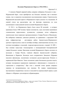 Колонии Мурманского берега в 1914-1918 гг. Орехова Е.А. С началом Первой мировой войны северное побережье Кольского п-ова – Мурманский берег, стало приобретать все большее значение, как в военных планах, так и в проектах послевоенного восстановления страны. Строительство Мурманской железной дороги и Мурманского порта усилило эту тенденцию. В данной статье мы рассмотрим, как эти факторы отразились на ходе колонизации и повседневной жизни колоний Мурманского берега. К 1914 г. на Мурманском берегу было около 90 колоний, в которых проживало более 3500 человек. Кроме колонистов, здесь постоянно проживали «самовольные переселенцы», духовенство, служащие, летом собиралось значительное число пришлых промышленников с Севера России и Финляндии. На побережье появилась довольно развитая, по сравнению с серединой XIX века, инфраструктура – регулярные рейсы Архангельско-Мурманского срочного пароходства (с мая по сентябрь-октябрь), навигационная система, сеть почтово-телеграфных отделений, гидрометеорологических станций. В 1899 г. был основан город-порт Александровск в незамерзающей Екатерининской гавани Кольского залива. Население колоний Мурманского берега состояло из выходцев с Севера России, главным образом Архангельской губернии, Финляндии и Норвегии. Большую часть пограничного Западного Мурмана населяли финляндцы, исключение составляли русско-карельская Печенга и норвежский Цып-Наволок. Такое положение давно беспокоило русские власти, которые подозревали мурманских норвежцев и финляндцев в «чуждости» и стремлении к сепаратизму. 1 При этом с военной точки зрения северные границы не воспринимались как опасные. Их охрана ограничивалась выставлением пограничных постов и посылкой на промысловый период судов «Бакан» и «Мурман» для контроля за браконьерами. 1 Орехова Е.А. Колонисты Мурманского берега – «свои» или «чужие»?//Этнос. Религия. Общество (в контексте межнациональных отношений). Краснодар, 2013. С. 248-261.